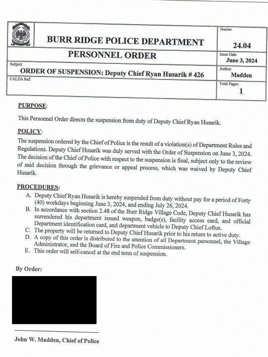 Burr Ridge records say Husarik's leave is from June 3 to July 26. He has surrendered his department-issued weapon, badge, facility access card, official department identification card, and department vehicle, according to the police chief's suspension order.