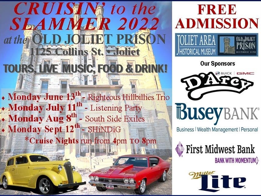 Monday Nights at the Old Joliet Prison will be hoppin' with show cars in the main prison parking lots in front of the prison off of Collins Street. FREE to the public! The Righteous Hillbillies Trio will be live band!