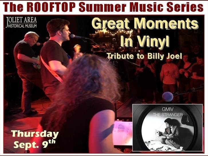 The Joliet Museum's "Outdoor Rooftop Music Series" continues Thursday, Sept. 9th at 7pm (doors open at 6:15pm) featuring Great Moments In Vinyl playing tribute to Billy Joel!