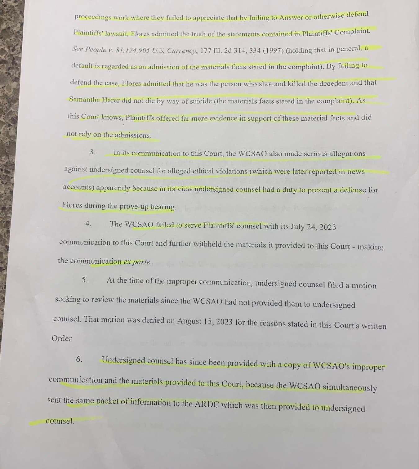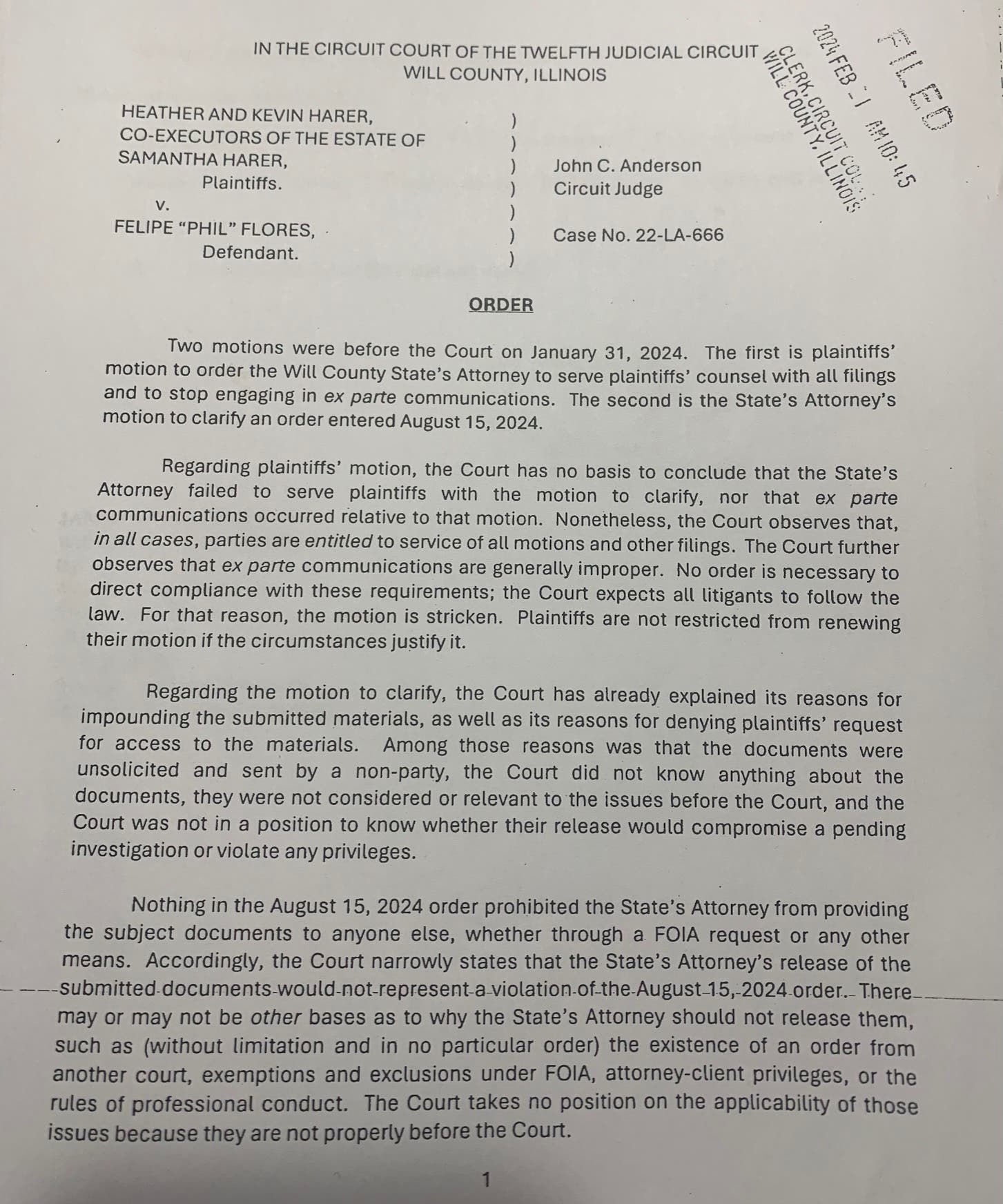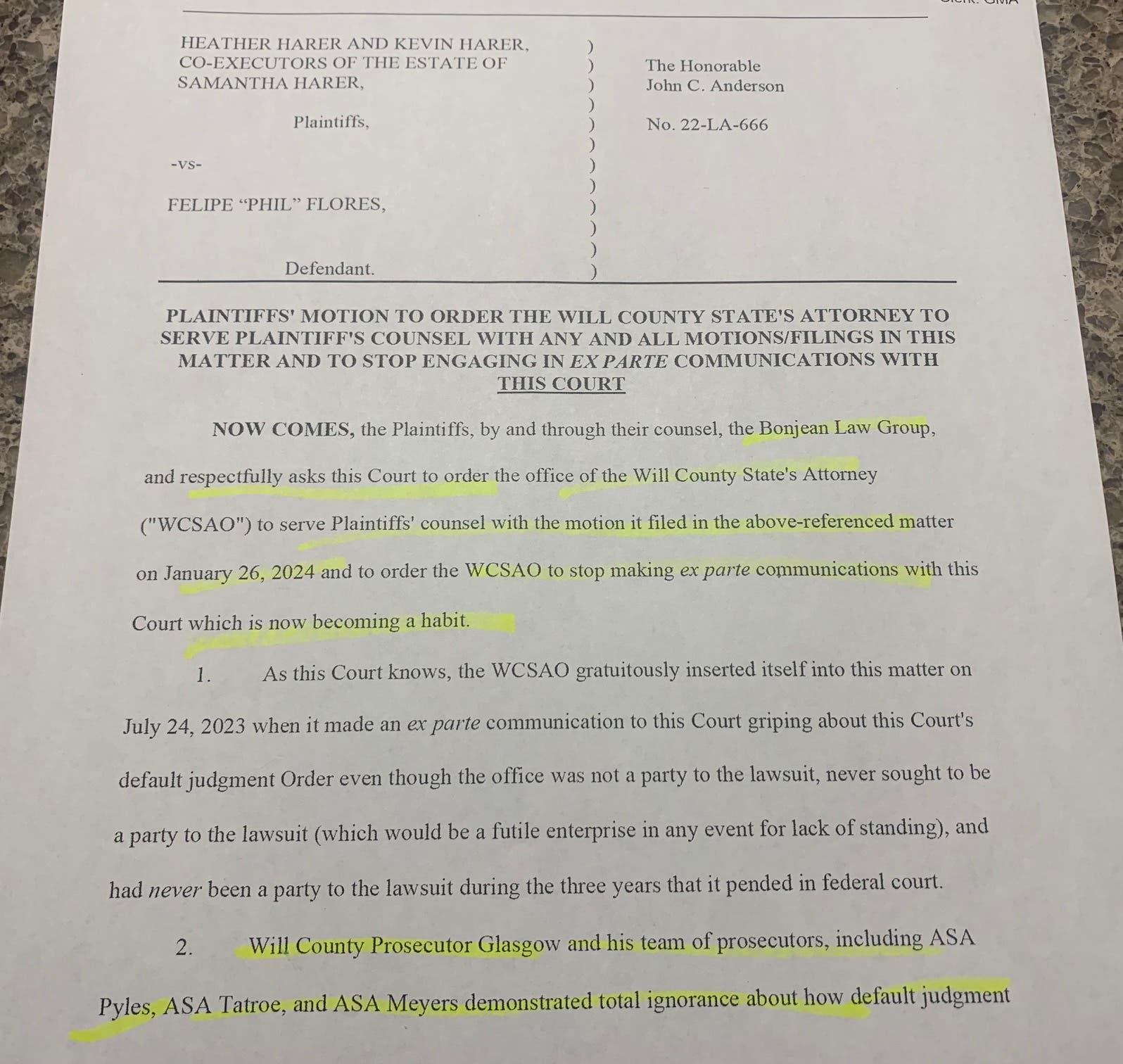 Even though the Will County State's Attorney's Office had no connection to the Harer family's wrongful death lawsuit against Flores, attorneys who answer to Glasgow began sending Judge Anderson various correspondence and documents that may have supported the belief that Harer had died of a self-inflicted gunshot wound.