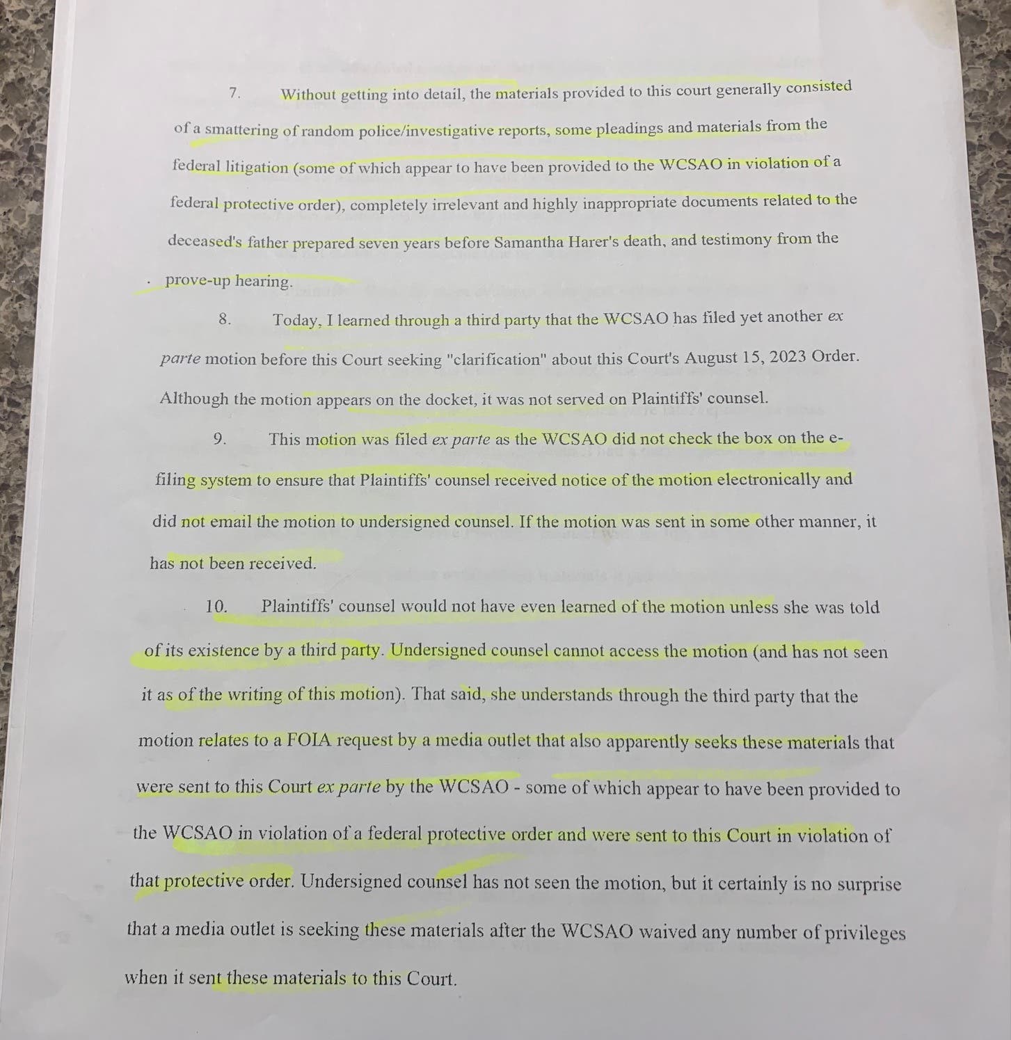 "Without getting into detail, the materials provided to this court generally consisted of a smattering of random police/investigative reports, some pleadings and materials from the federal litigation case some of which appear to have been provided to the WCSAO in violation of a federal protective order, completely irrelevant and highly inappropriate documents related to the deceased's father prepared seven years before Samantha Harer's death and testimony from the prove-up hearing," Bonjean wrote the court Jan. 26.