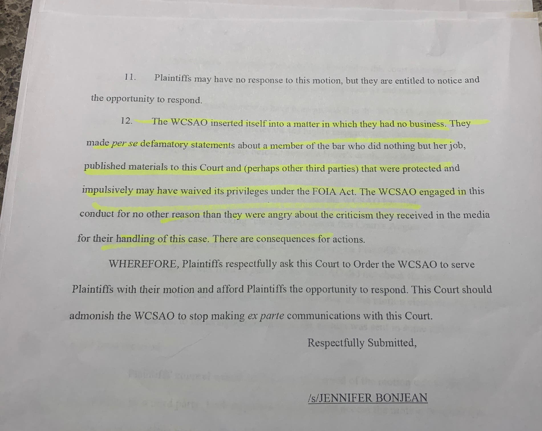 Bonjean relayed to the judge in her Jan. 26 filing that she more or less knows about the documents Glasgow's staff sent to Anderson because Glasgow and his staff went ahead and filed a complaint against her with the Illinois Attorney Registration & Disciplinary Commission.