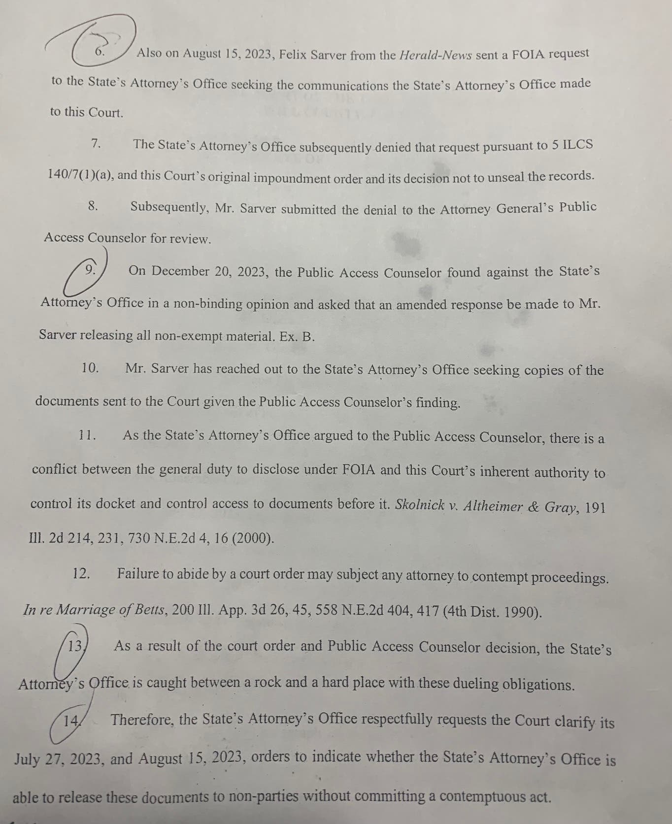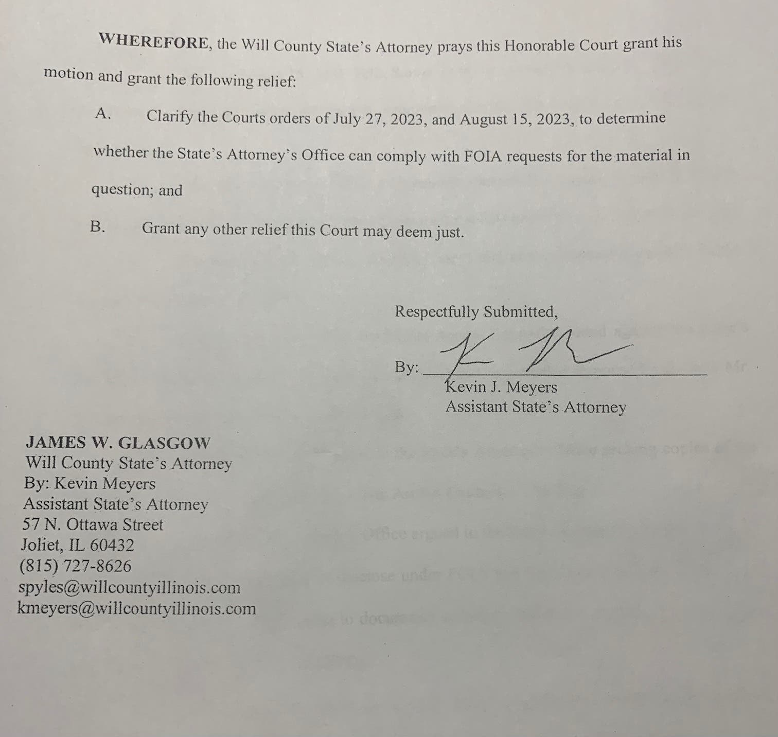 Because of the AG's ruling, Glasgow's lawyers filed another motion in January asking Judge Anderson for guidance. "As a result of the court order and Public Access Counselor decision, the State's Attorney's Office is caught between a rock and a hard place with these dueling obligations," Assistant State's Attorney Kevin Meyers wrote. "Therefore, the State's Attorney's Office respectfully requests the court clarify its July 27, 2023, and August 15, 2023, orders to indicate whether the State's Attorney's Office is able to release these documents to non-parties without committing a contemptuous act."