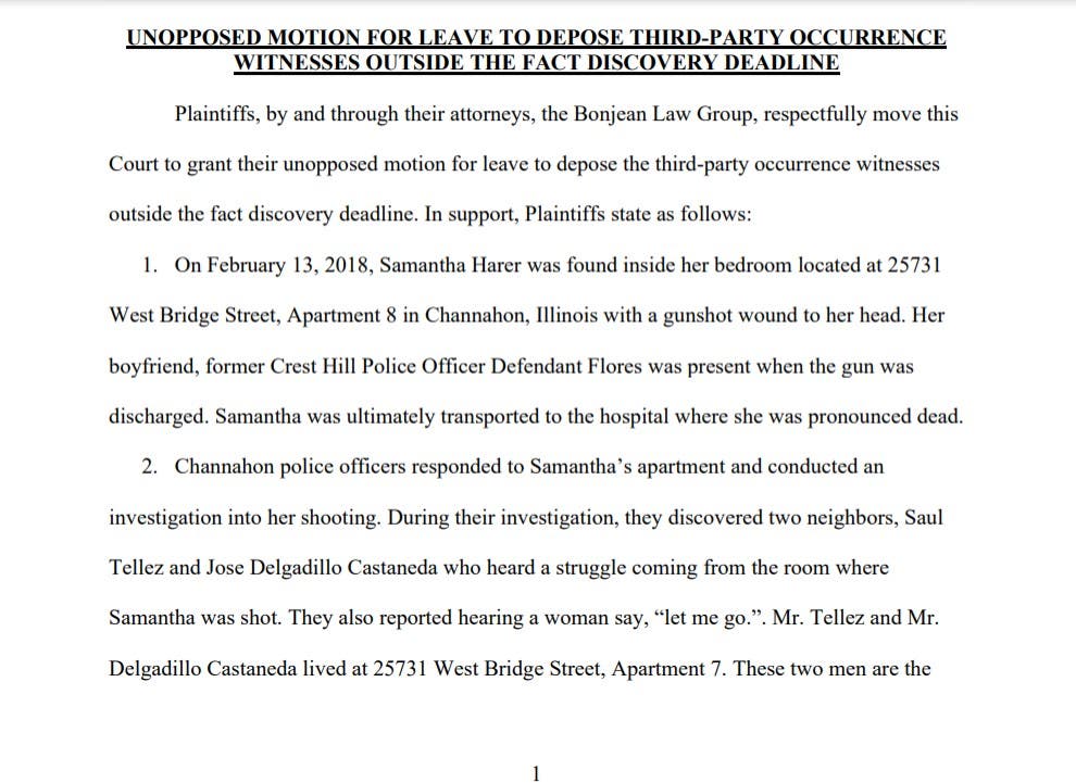 "Plaintiffs Heather and Kevin Harer bring a second amended complaint alleging that their daughter, Samantha Harer, was killed by her boyfriend, Felipe “Phil” Flores. Flores was a police officer for the Town of Crest Hill," this week's court ruling indicated. "He allegedly shot Samantha to death in her apartment in the Town of Channahon, and Channahon police officers allegedly covered up the shooting as a suicide. Plaintiffs sued several defendants, with only one count brought against Crest Hill ..."