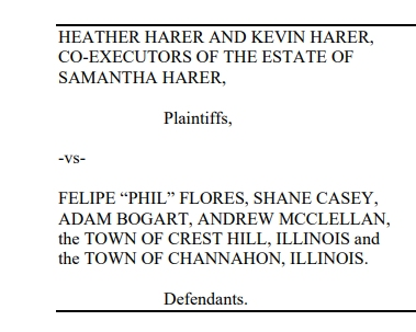 Why could the case take a long time to litigate? "Channahon Defendants have made an initial determination that there are potentially 85 witnesses involved in the case, including two plaintiffs, three individual defendants, two of plaintiffs’ attorneys; one of Channahon’s attorneys; three healthcare providers; four emergency medical responders; 40 police officers and evidence technicians involved in the investigation into Samantha Harer’s death; 17 neighbors of Samantha Harer who were interviewed in the investigation; and 13 other witnesses that knew Samantha Harer that were interviewed during the investigation."