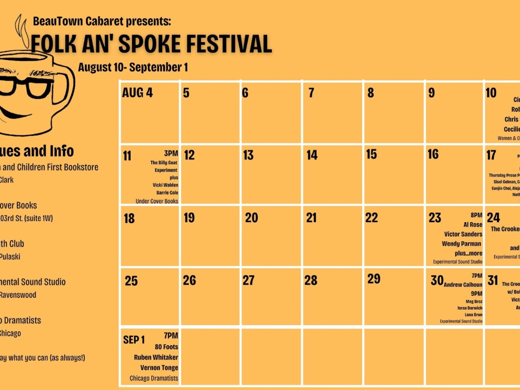 CHICAGO – BeauTown Cabaret presents the return of the Folk an’ Spoke Festival, August 10 - September 1, at locations throughout Chicago. The Folk an’ Spoke Festival, is curated by the godfather of Chicago fringe Beau O’Reilly and celebrates Chicago’s rich music, poetry and theatre scenes with a series of events. The complete schedule of performances and to reserve pay-what-you-can tickets, suggested donation $20, go to BeauOReilly.com.