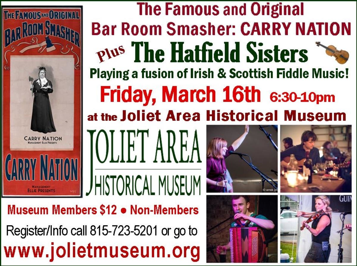 Ellie Carlson brings her lively historical reenactment & Bar Smashing of the storied prohibitionist on the eve of St. Patricks Day to the Joliet Area Historical Museum. The Hatfield Sisters band will follow with a concert, playing a fusion of Irish and Scottish Fiddle Music!
