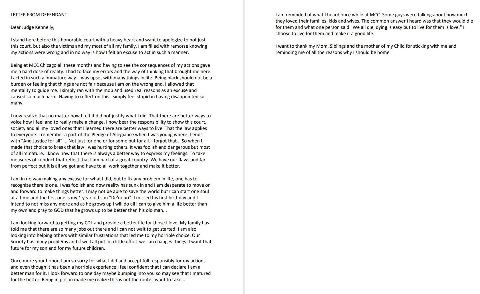 "Being black should not be a burden or feeling that things are not fair because I am on the wrong end. I allowed that mentality to guide me," he said. "I simply ran with the mob and used real reasons as an excuse and caused so much harm. Having to reflect on this, I simply feel stupid in having disappointed so many."