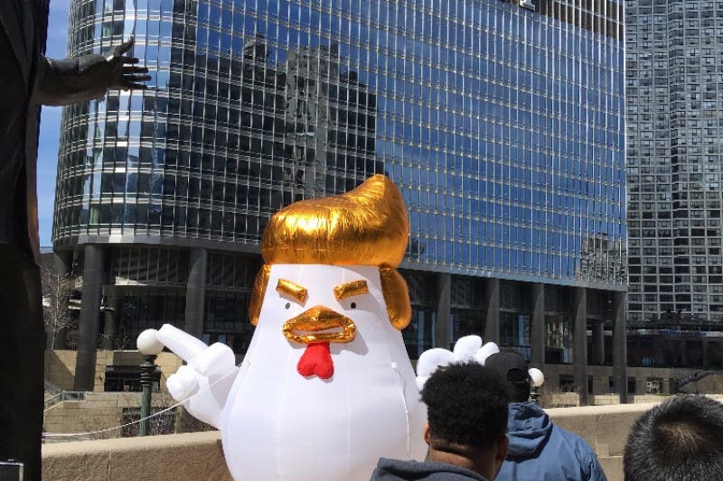 Taran Singh Brar, one of the rally's organizers who also emceed the event, told the Tribune the demonstration was "a huge success." Certainly, one of the rally's highlights and its centerpiece was the "Chicken Don" mascot that help set the tone for a group "Chicken Dance." Brar helped bring the Trump-resembling inflatable chicken, also known as the Trump Rooster, by raising a little more than $10,000 through a GoFundMe campaign to have it delivered to Chicago for the protest. The money covered the cost of the inflatable, as well as march, including permits, police security, the stage and sound system and other expense, according to the fundraising page.