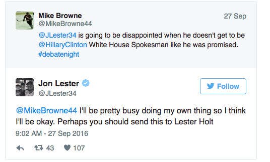 How did we miss this. People were tweeting at Jon Lester after the debate thinking he was Lester Holt pic.twitter.com/jTZkeclKiK