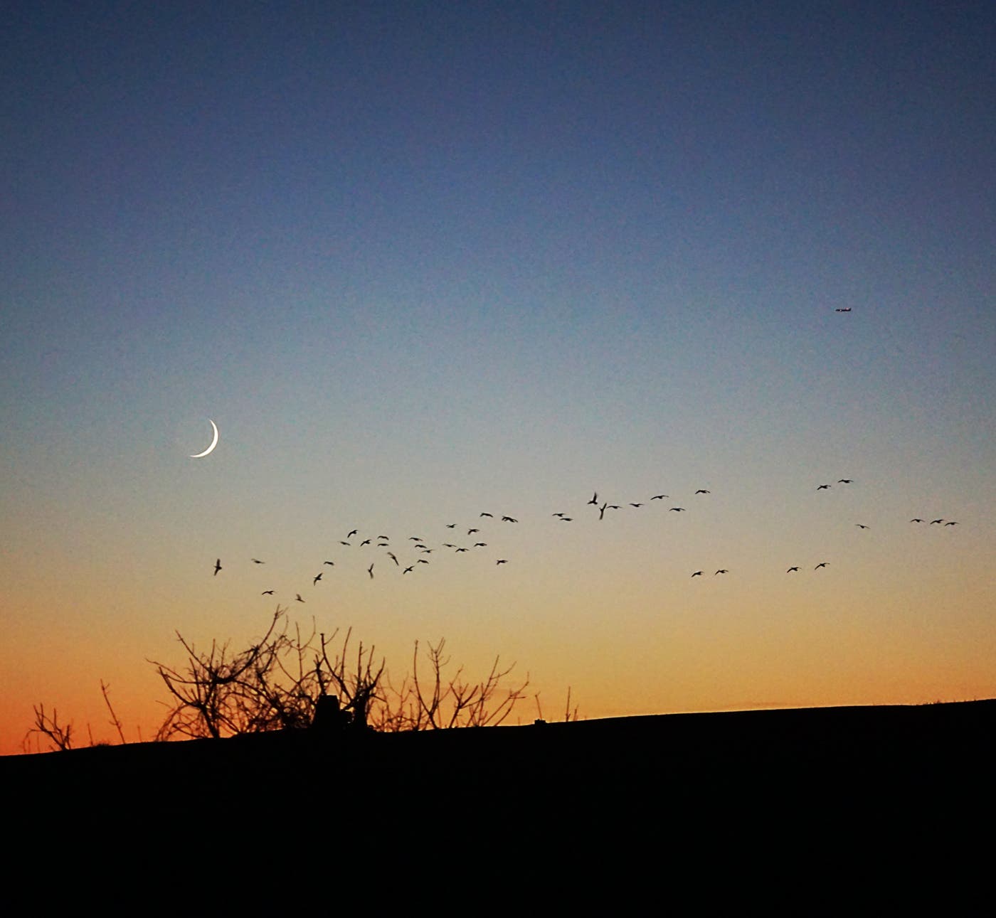 Marcia Hirsch sent in this photo she took from the balcony of her home in the Techny Basin Reservoir area of Northbrook. A team of geese circles an airplane, which they do most nights, according to the photographer.