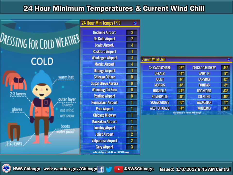 The National Weather Service this morning reported the lowest wind chill reading for a suburban town just before 9 a.m. on Friday at O’Hare Airport, -16, with several other towns, including West Chicago, DeKalb and Wheeling, reporting wind chills as low as -14. Meanwhile, temperature readings over the past 24 hours have been … very cold. The DeKalb Airport reported a temperature of -2 while the Waukegan and DuPage airports recorded a low temp of -1.