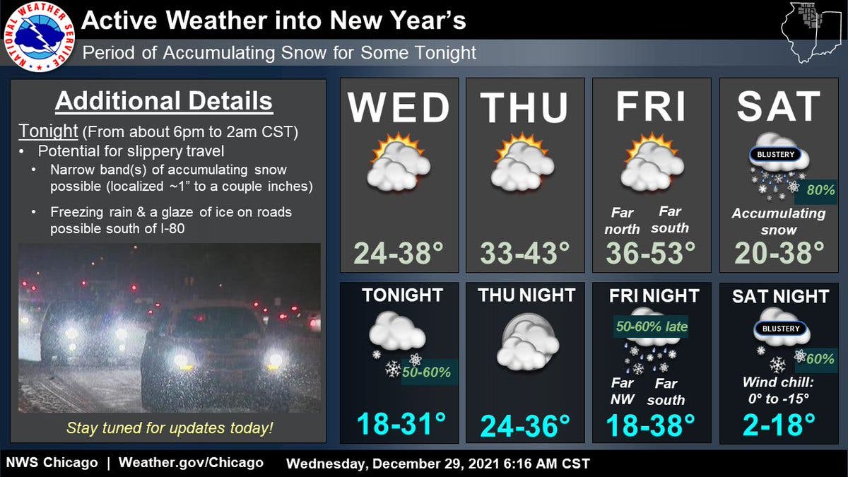 But with the streak broken, more snow is headed our way. A period of accumulating snow is possible once again Wednesday night for some in the Chicago area, the weather service said. Light snow will develop across parts of northern Illinois after 6 p.m. Wednesday, and then end from northwest to southeast after midnight, according to the weather service.
