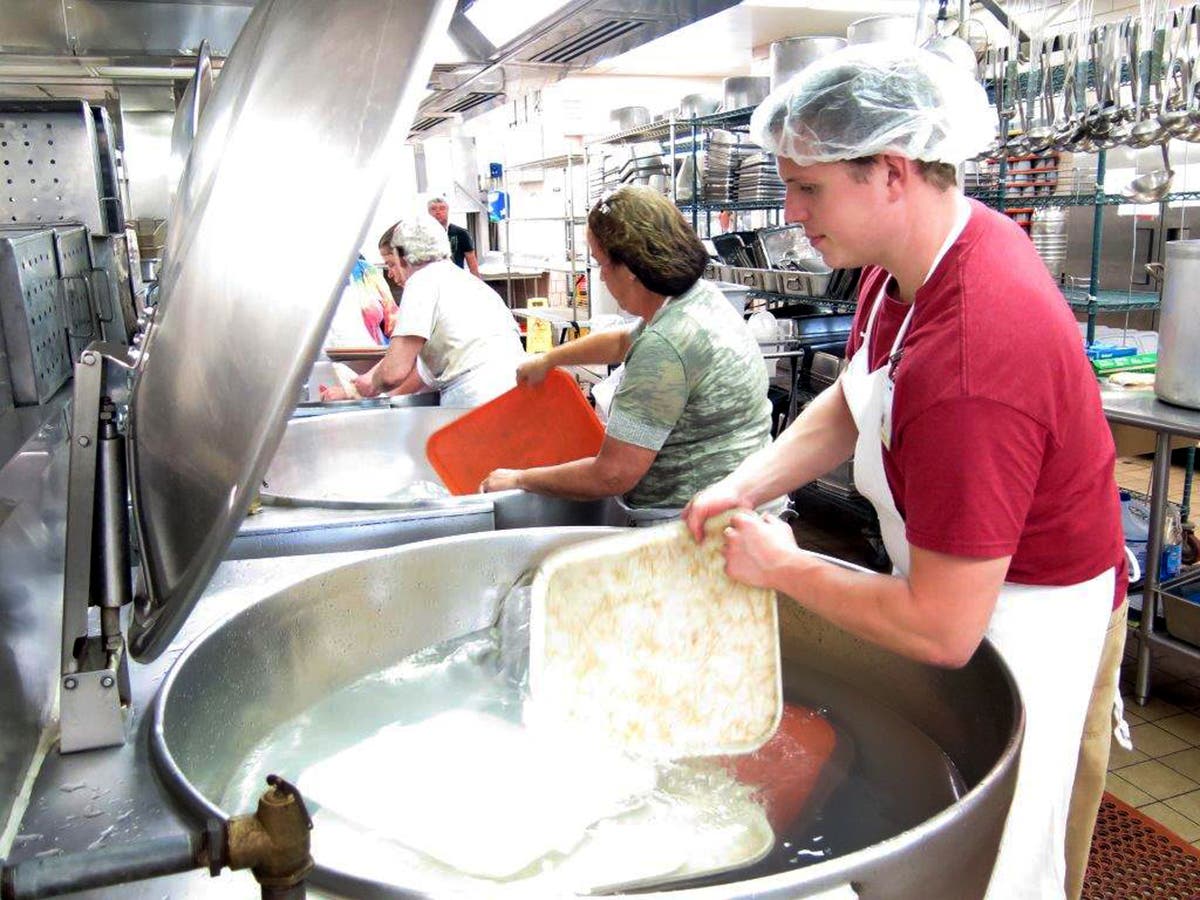 Image: In this Sept. 10, 2015 photo, kitchen workers Andrew Campbell, right, and Mary Ueberlauer, center, wash serving trays by hand in large vats usually used for cooking at the state veterans home in Quincy, Ill. (AP Photo/Alan Scher Zagier)
