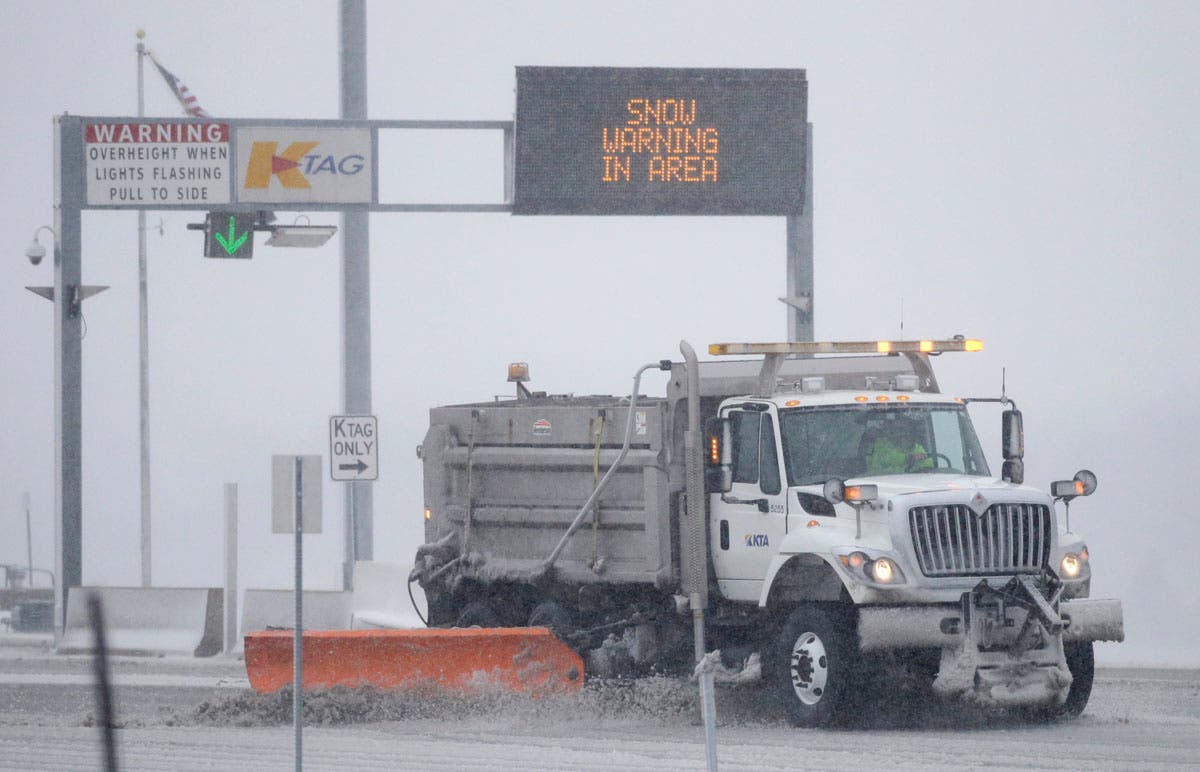 A plow removes snow at an entrance of the Kansas Turnpike near Lawrence, Kansas. The turnpike section of I-70 remains open. I-70 is closed west of Junction City, Kansas. The area is under a blizzard warning. (AP Photo/Orlin Wagner)