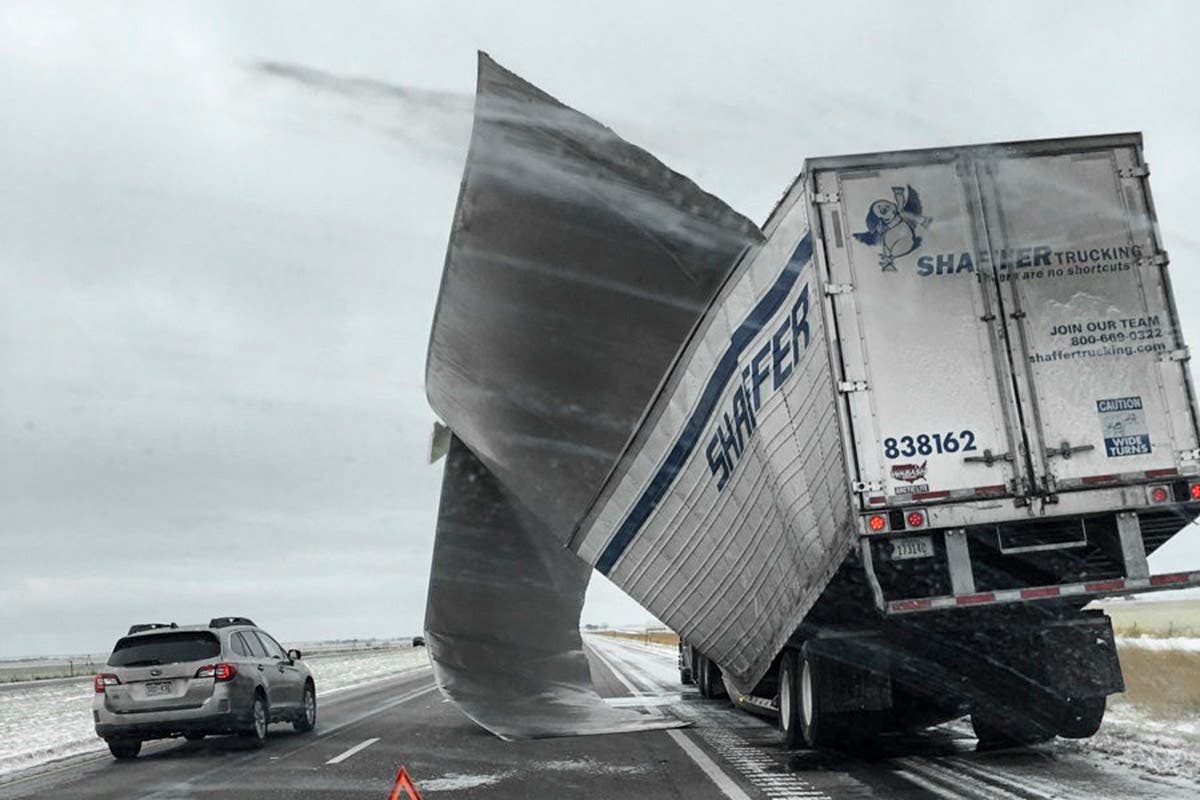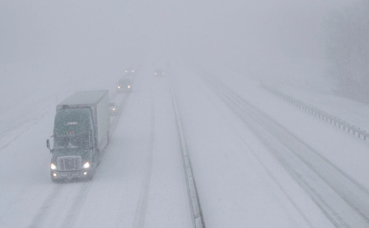 A broken-up trailer amid blowing snow on Interstate 80 near Bradshaw, Nebraska is seen Sunday evening in this file photo released by the Nebraska State Patrol. Blizzard-like conditions have closed highways and delayed air travel as a winter storm moved through the Midwest. (Nebraska State Patrol via AP)