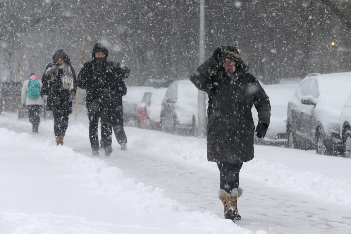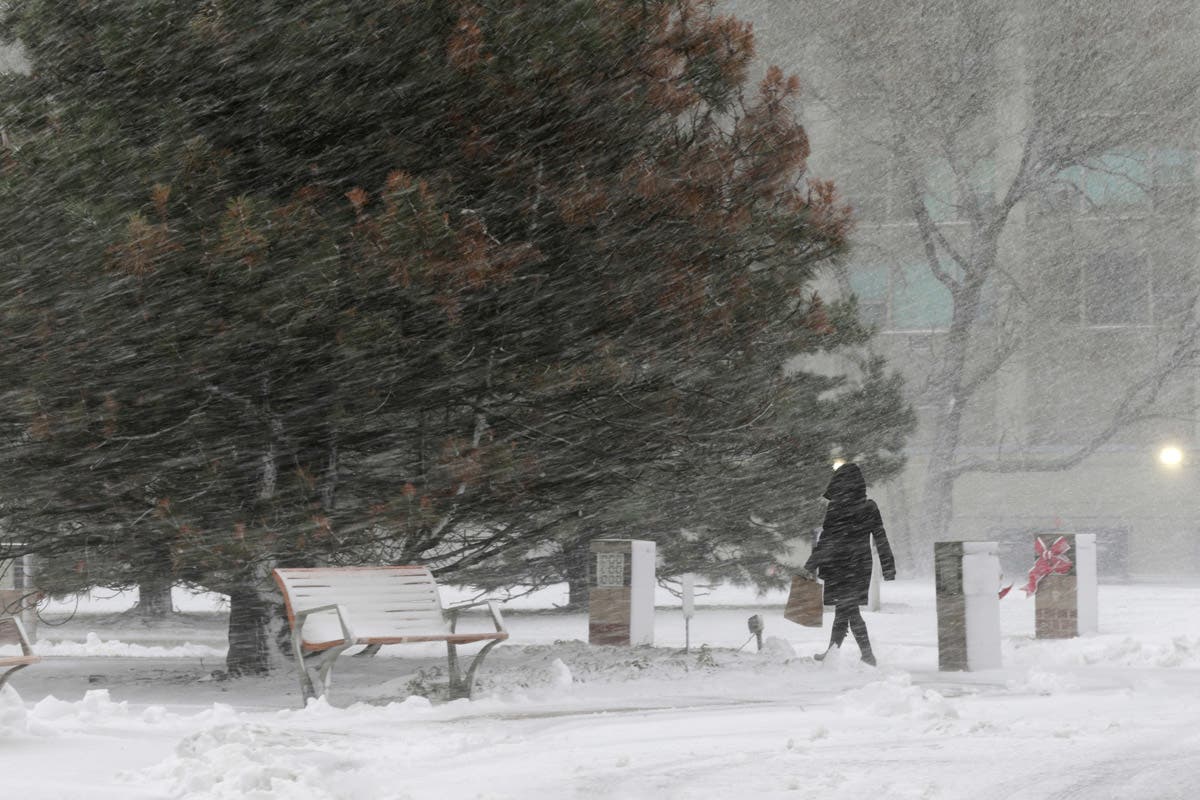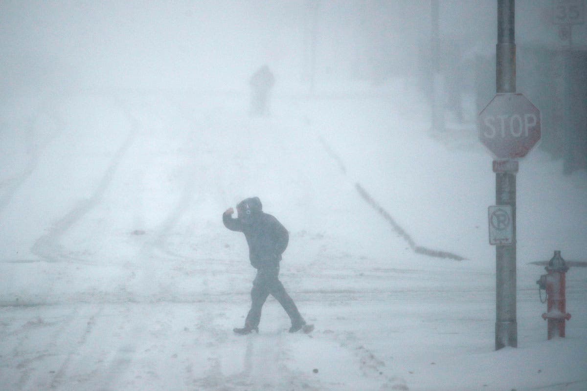 Pedestrians walk as snow falls Sunday in Kansas City, Missouri. Blizzard-like conditions have closed highways and delayed air travel as a winter storm moves through the Midwest. (AP Photo/Charlie Riedel)