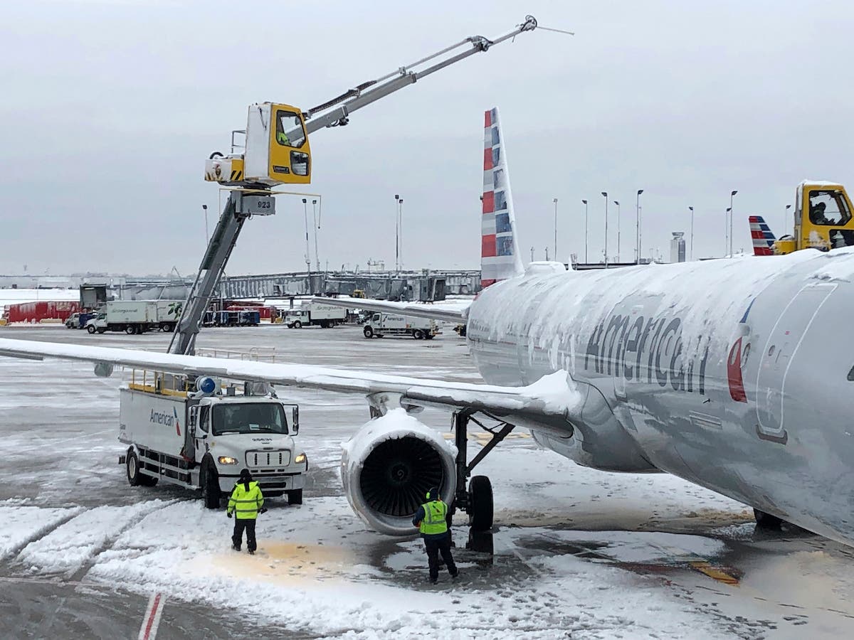 Crews de-ice an American Airlines plane at O'Hare International Airport Monday in Chicago. The National Weather Service said 7.5 inches of snow fell at Chicago's O'Hare International Airport and 4.9 inches fell at Midway International Airport. (AP Photo/Noreen Nasir)