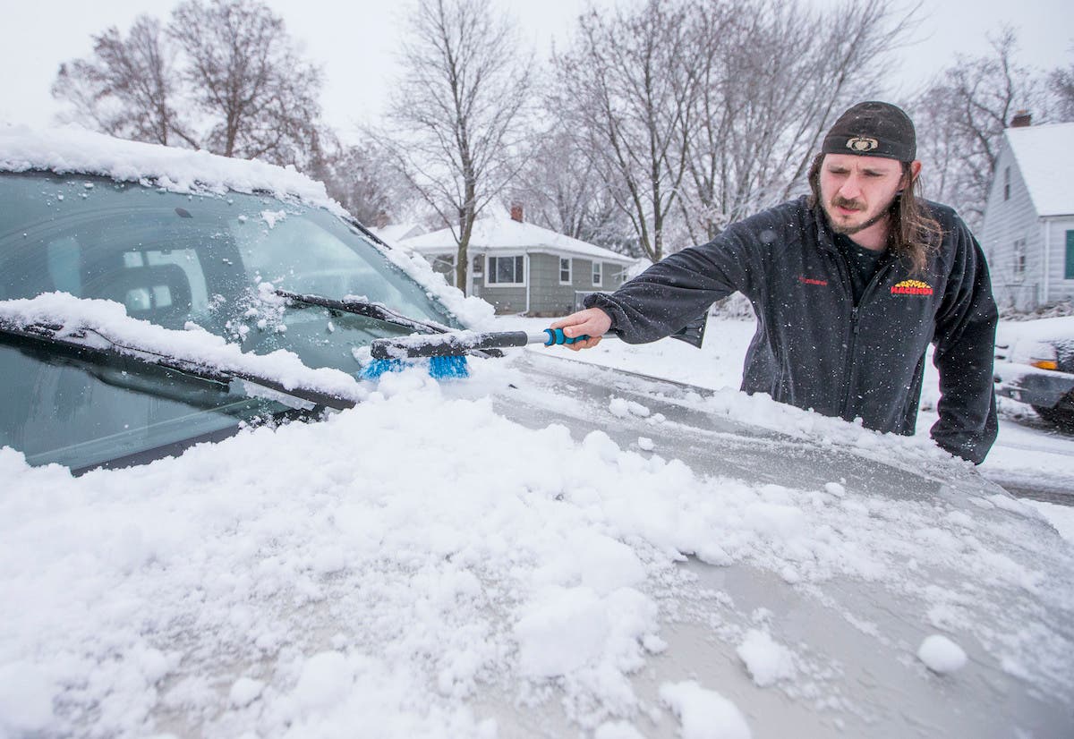 Patrick Kaczmarek clears snow off his car on earlier this morning outside his home in South Bend, Indiana. (Robert Franklin/South Bend Tribune via AP)