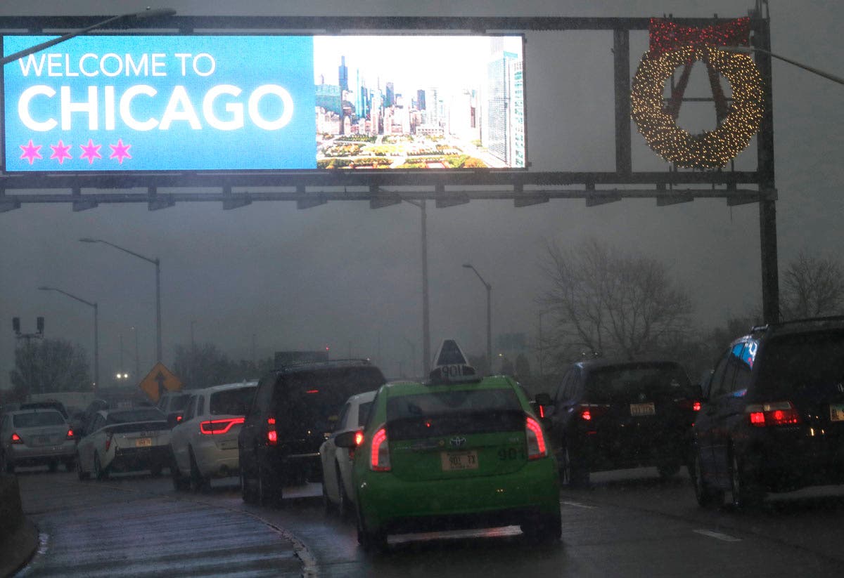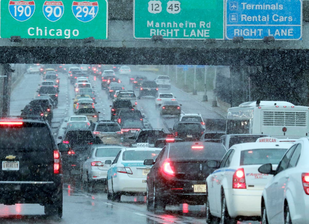 Heavy traffic is seen on an expressway near O'Hare International airport in Chicago. More than 350 flights already canceled ahead of blizzard-like storm taking aim at Chicago. A winter storm warning has been extended for Cook, DuPage, Grundy, Kendall, Lake and Will counties through 9 a.m. Monday, according to the National Weather Service. (AP Photo/Nam Y. Huh)
