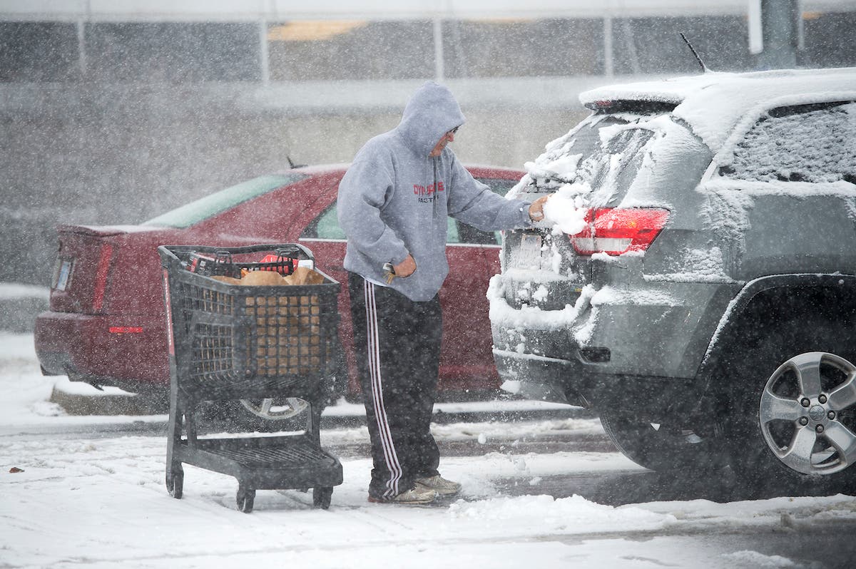 Anthony Walters of Mission, Kansas, wipes snow from a vehicle before loading groceries into it in Roeland Park, Kansas. (Tammy Ljungblad/The Kansas City Star via AP)