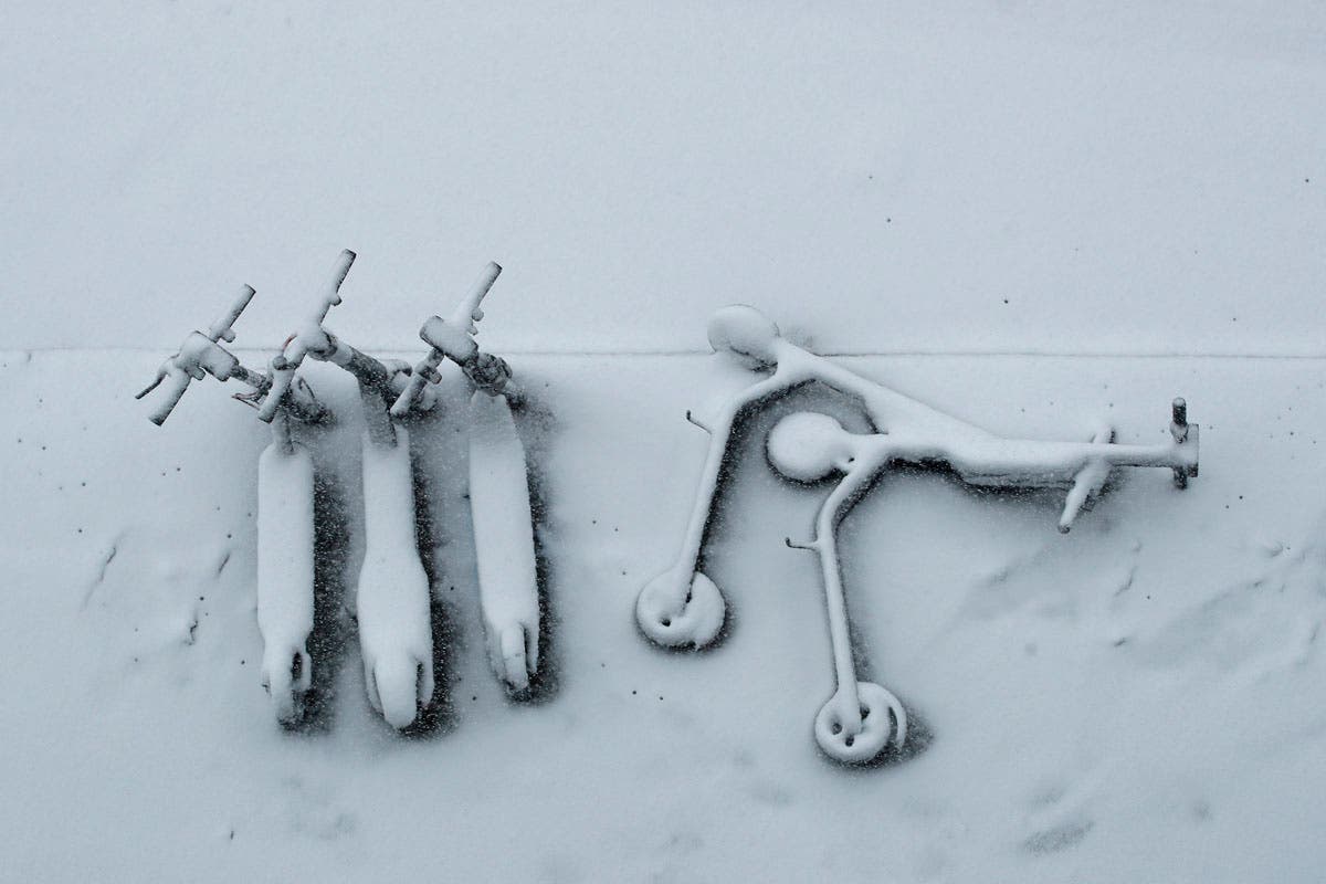 Electric rental scooters are covered with fresh snow on a sidewalk in downtown Kansas City, Missouri. (AP Photo/Charlie Riedel)