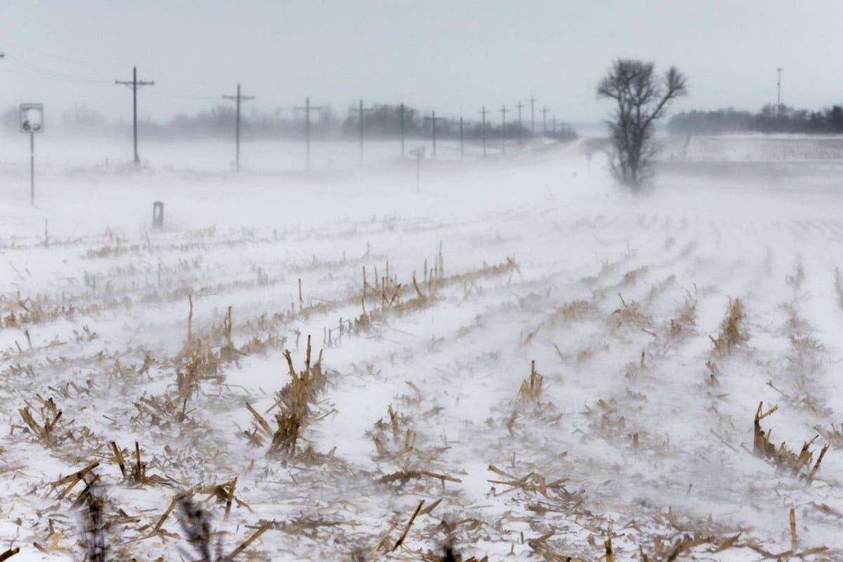 Rows of corn stalks stand in blowing snow north of Nebraska City, Nebraska. (AP Photo/Nati Harnik)