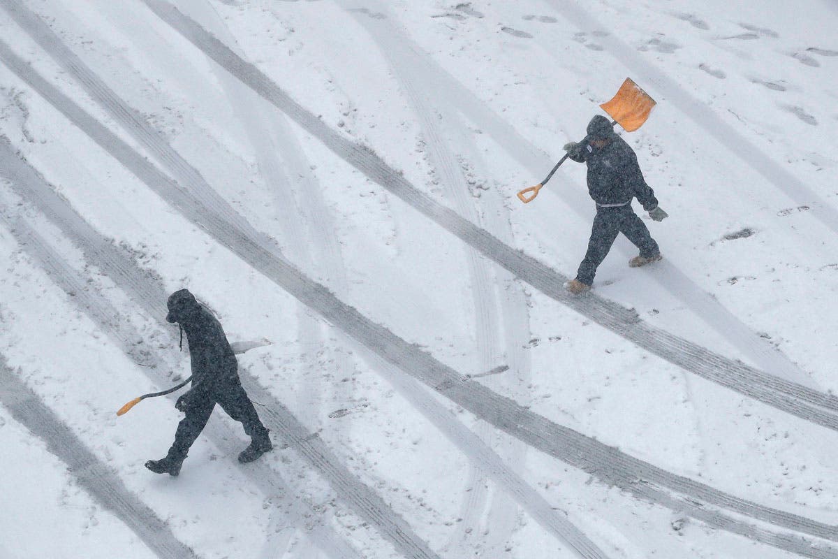 Workers carry snow shovels as snow falls in downtown Kansas City, Missouri. (AP Photo/Charlie Riedel)
