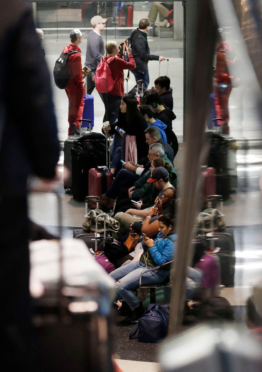 Passengers sit as they wait for their flight at O'Hare airport in Chicago, Sunday, Nov. 25, 2018. More than 350 flights already canceled ahead of blizzard-like storm taking aim at Chicago. (AP Photo/Nam Y. Huh)