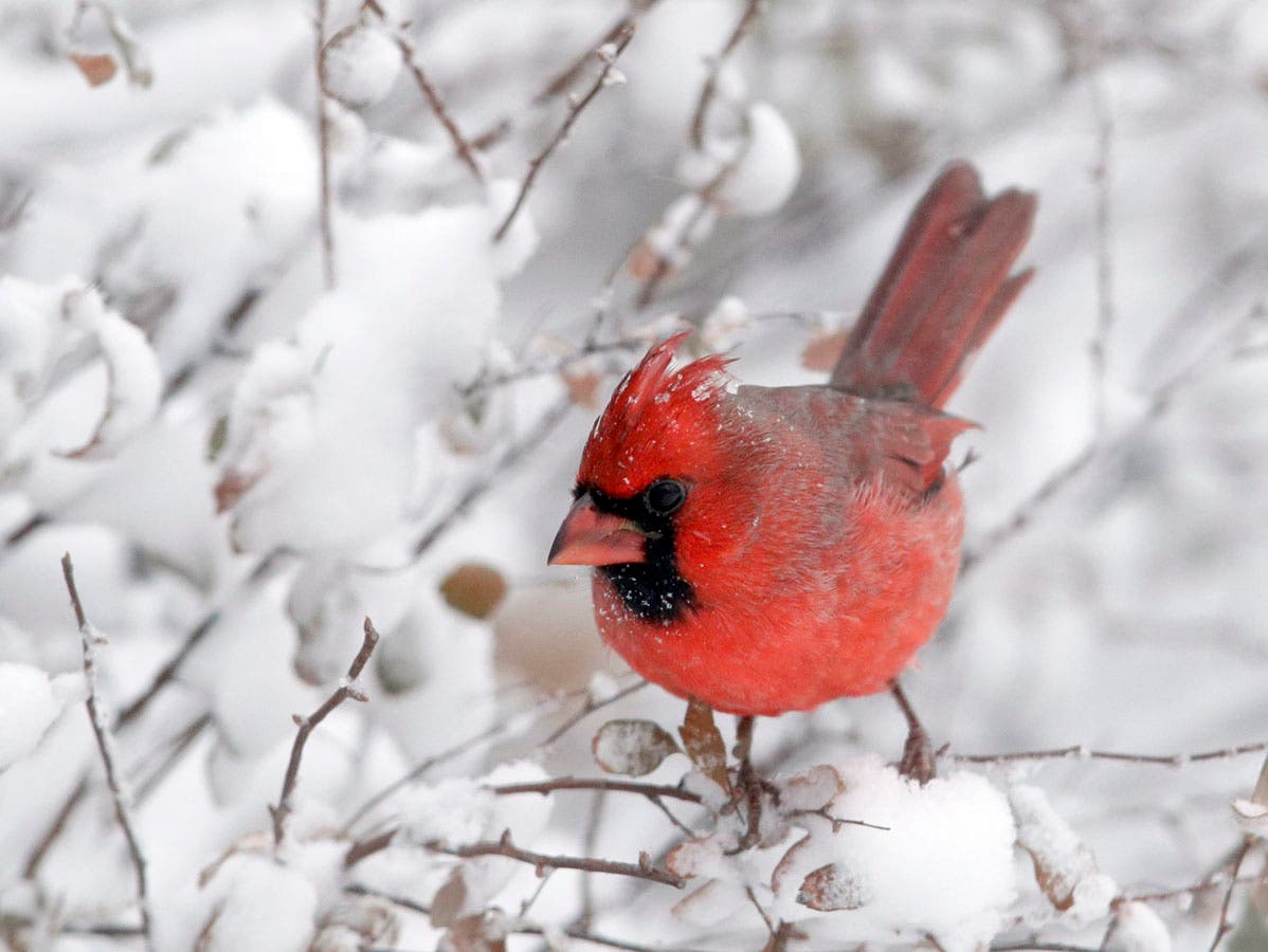 A cardinal perches on snow-covered twigs in Lawrence, Kansas. (AP Photo/Orlin Wagner)