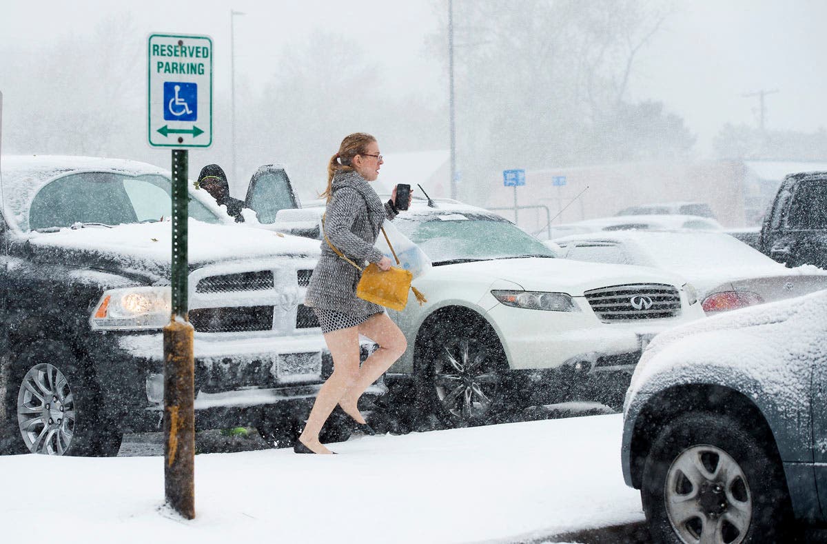 A shopper dashes to her car during a blizzard after shopping at the Walmart in Roeland Park, Kansas. (Tammy Ljungblad/The Kansas City Star via AP)