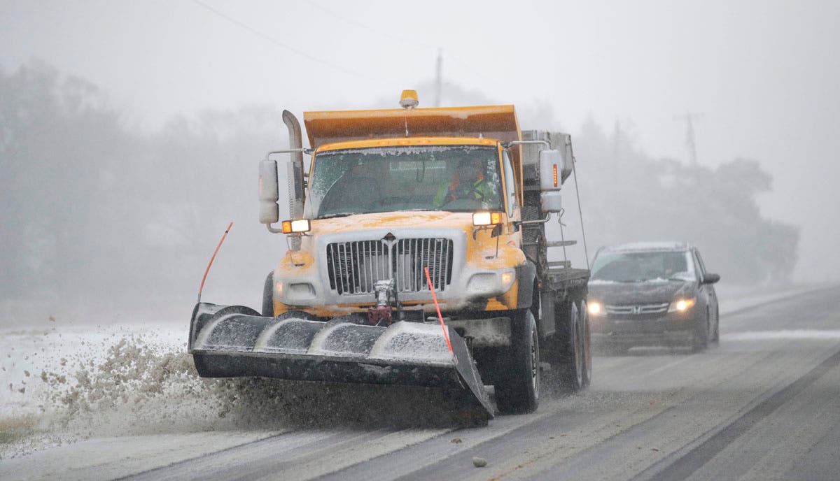 A plow clears snow from Road 438 in Douglas County near Lawrence, Kansas. The area is under a blizzard warning. (AP Photo/Orlin Wagner)
