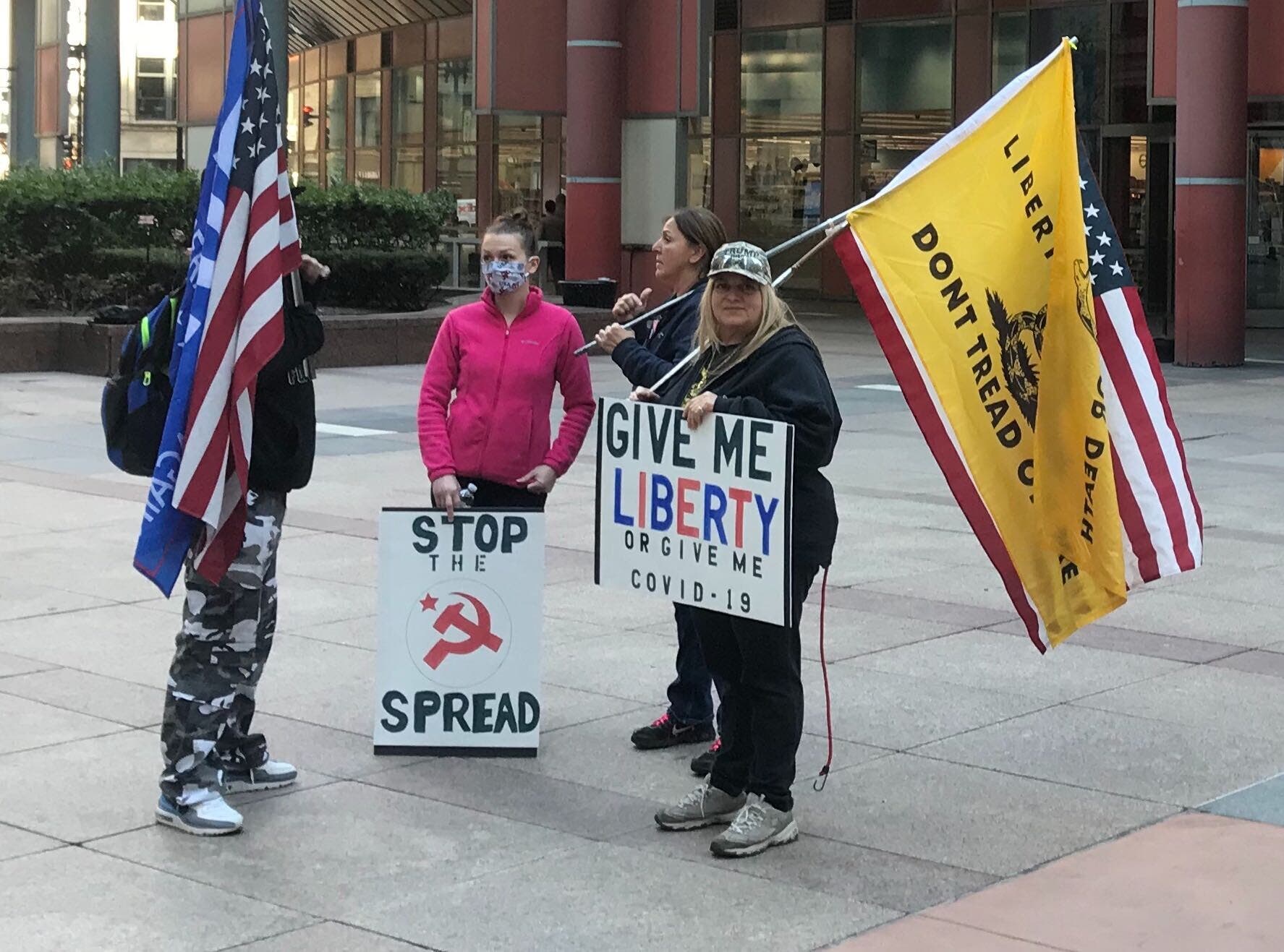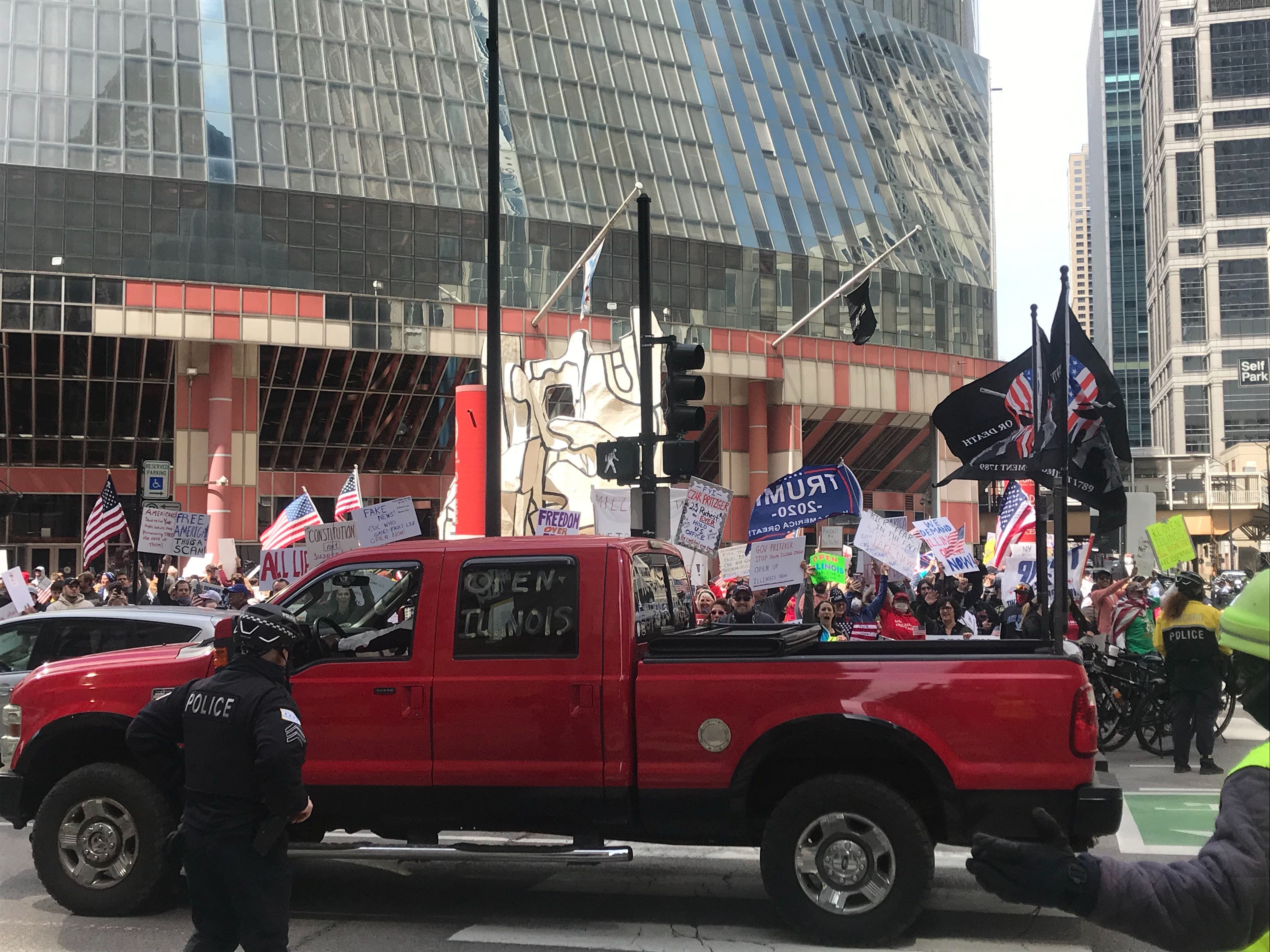 CHICAGO, IL—Protesters gathered outside the Thompson Center Friday to demand that Gov. J.B. Pritzker lift his coronavirus restrictions and reopen the state’s economy. The state's modified, extended stay-at-home order took effect on Friday.