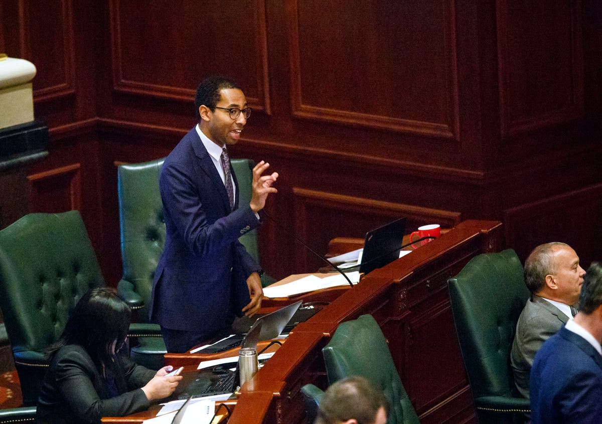 In this May, 31, 2017 file photo, Rep. Christian Mitchell, D-Chicago, speaks on the House floor at the Capitol in Springfield/ A political cartoon circulated by a conservative Illinois think tank with ties to Republican Gov. Bruce Rauner has triggered accusations of racism and insensitivity. The rendering depicted a black school child from Chicago begging for money from a cigar-smoking white man in a suit. "There is a way to make a policy point that's legitimate, but not in a way that caricatures African Americans and provokes a dark history," said Mitchell.(Rich Saal/The State Journal-Register via AP)