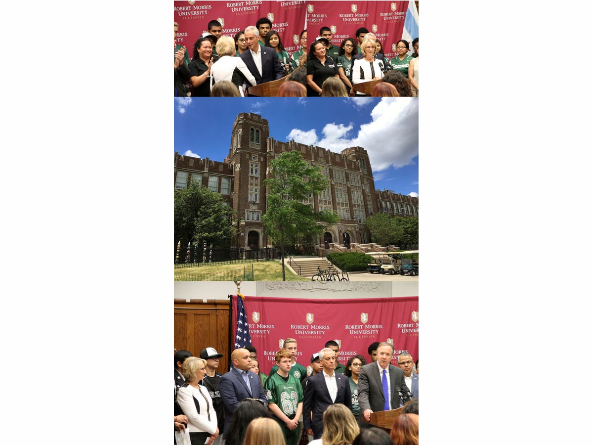 On Monday, June 19, Mayor Rahm Emmanuel, representatives from Chicago Public Schools and RMU President Mablene Krueger celebrated the first year of a partnership between Robert Morris University and Steinmetz College Prep High School that provides college credit and higher education experiences for Steinmetz students. Steinmetz is located at 3030 N. Mobile on Chicago’s northwest side.