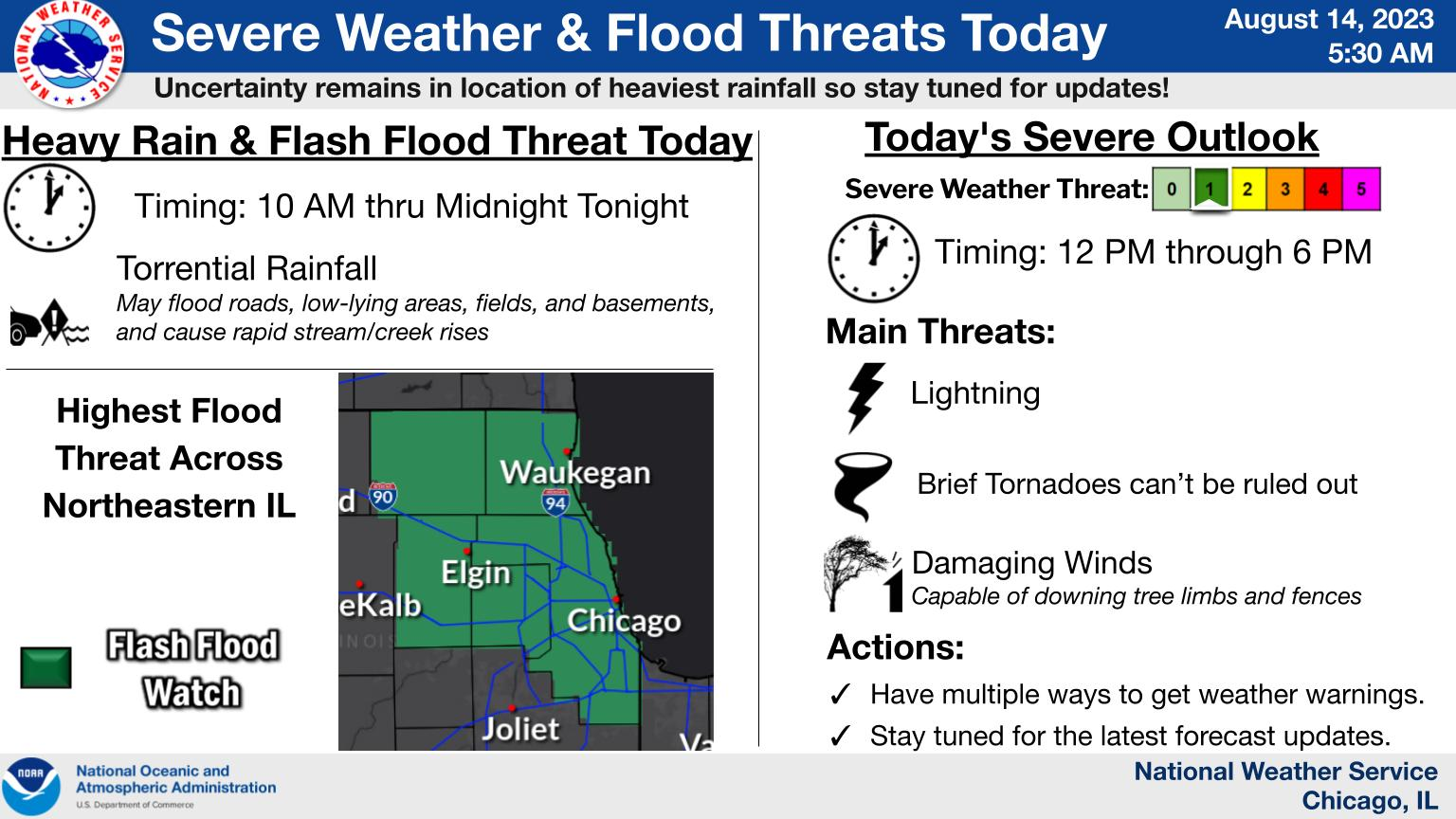 Heavy rain could hit between 10 a.m. and midnight, with torrential rainfall that could flood roads, low-lying areas, fields and basements. The risk for severe storms is between noon and 6 p.m., the National Weather Service said.