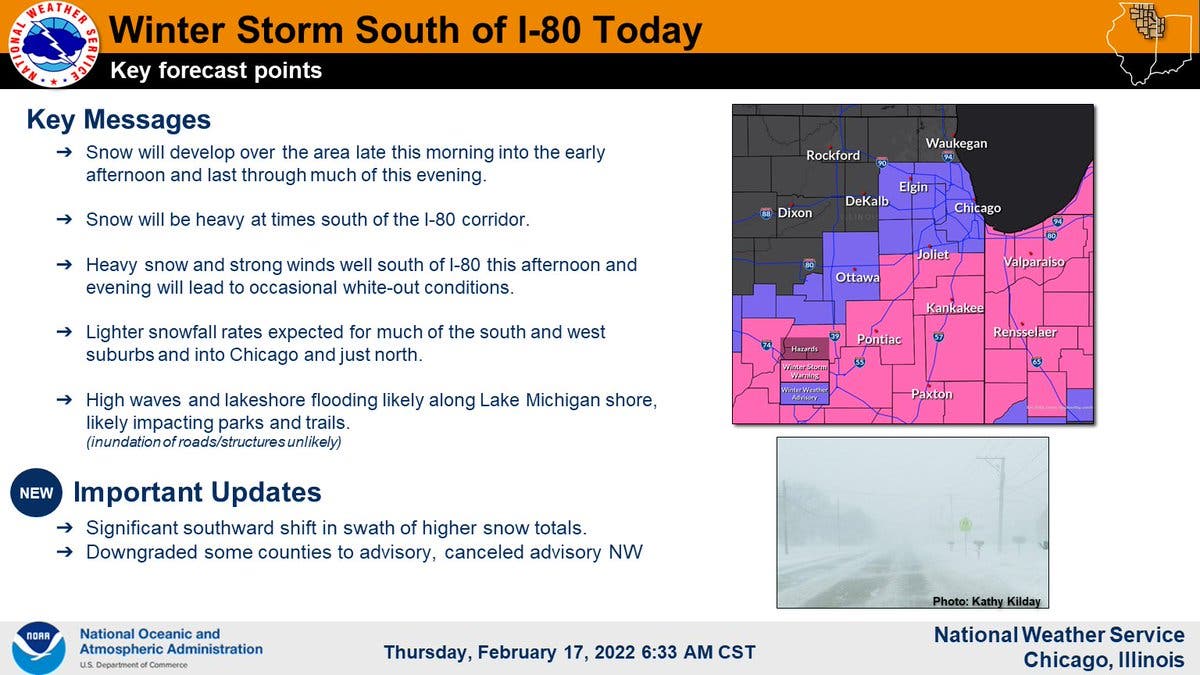 A winter weather advisory remains in effect for Kane, Kendall, DuPage, central and southern Cook and northern Will counties from noon to 9 p.m. Thursday. Winter storm warnings remain in effect for southern and eastern Will, Grundy and Kankakee counties.