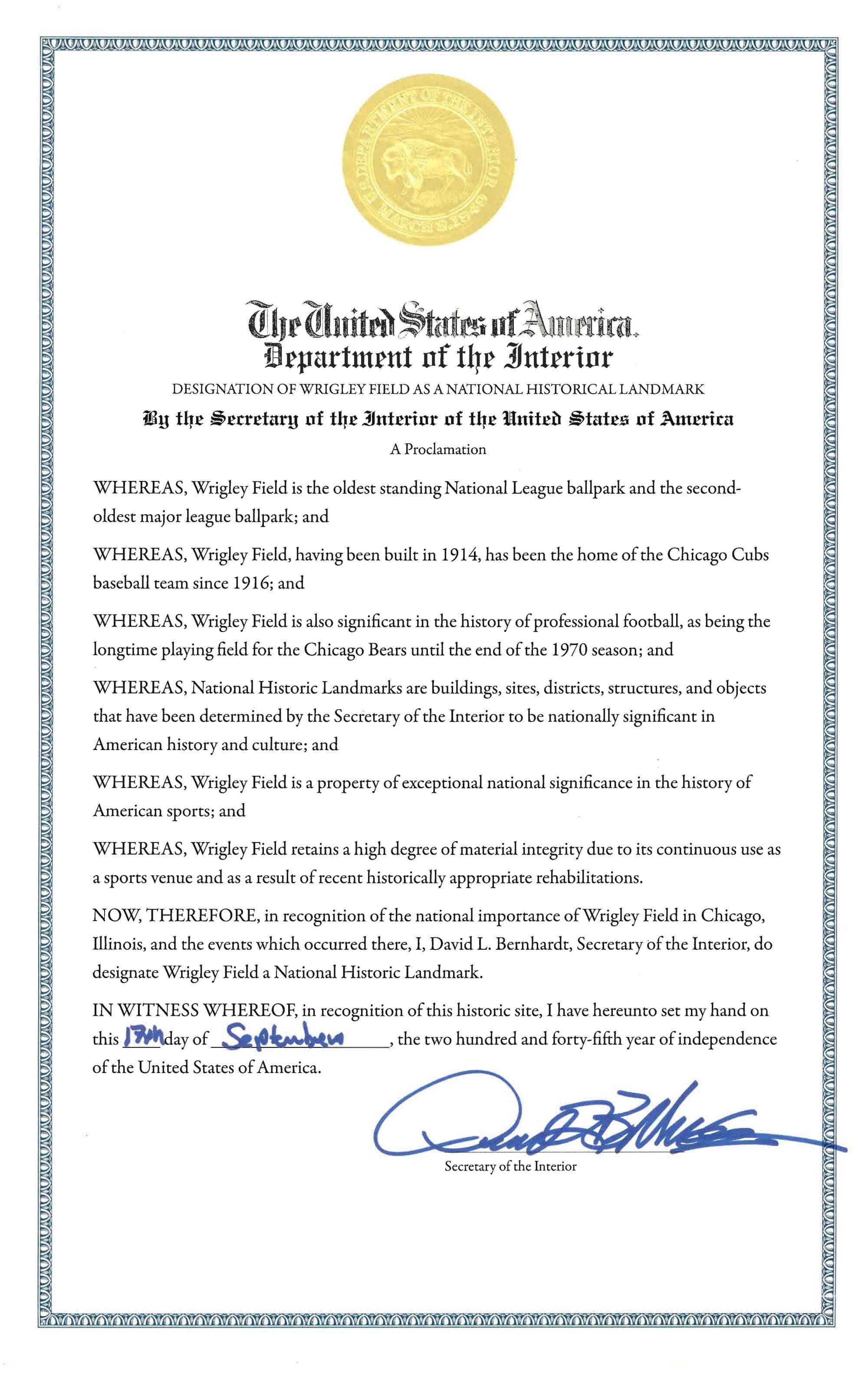 “The historical significance of Wrigley Field is interwoven into our nation’s story and a key part of what has become America’s beloved pastime for over a century,” Bernhardt said. “It is with great enthusiasm that I designate this iconic national treasure, the site of many legendary events, innovations and traditions in baseball history, as a National Historic Landmark.”