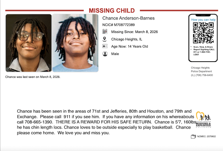 Chance was last seen March 8 in Chicago Heights, VanVliet told Patch. VanVliet said she has spoken with police in Chicago Heights and Chicago, as well as the Cook County Sheriff's Office. With authorities calling him a runaway, VanVliet has turned to social media in hopes of raising awareness and helping find him.