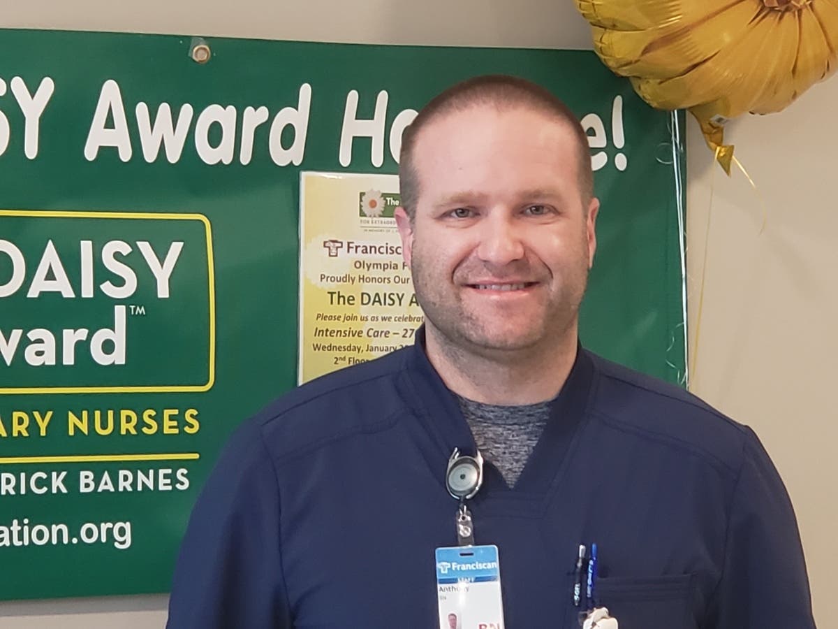 Franciscan Health salutes nurses like Anthony Perretta who deliver extraordinary, compassionate, and skillful care. As part of this recognition, he received a DAISY award pin, the Healer's Touch sculpture, a DAISY Award certificate, and a box of Cinnabon cinnamon rolls to share with coworkers. Funding for the DAISY Award is provided by the Franciscan Health Foundation.