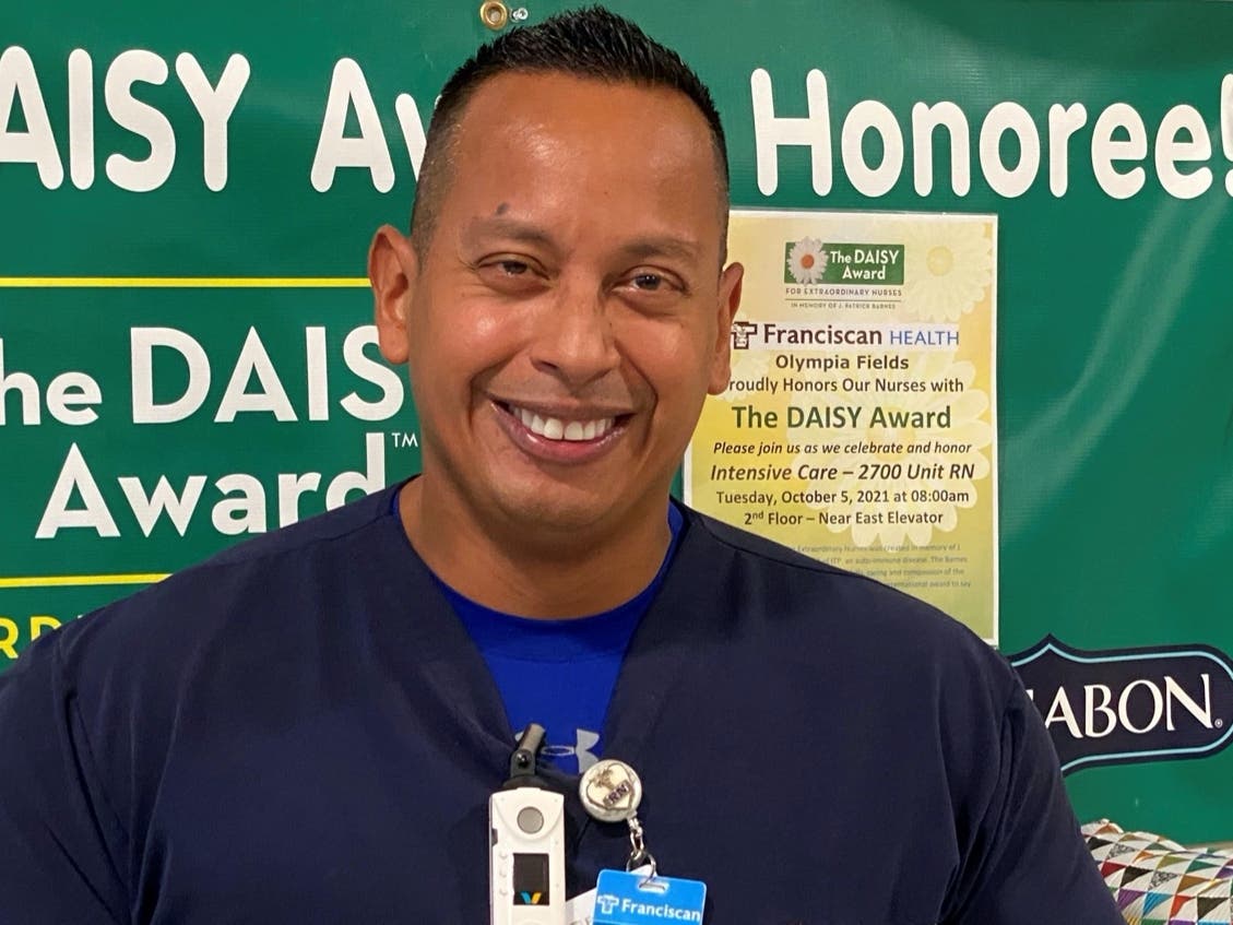 Franciscan Health salutes nurses like Paul Cruz who deliver extraordinary, compassionate, and skillful care. As part of this recognition, he received a DAISY award pin, the Healer's Touch sculpture, a DAISY Award certificate, and a box of Cinnabon cinnamon rolls to share with coworkers. Funding for the DAISY Award is provided by the Franciscan Health Foundation.