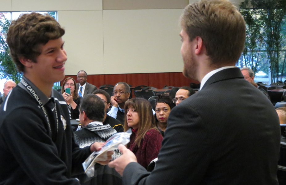 Picture: Liam Quinn ’16 (Flossmoor) receives his award from Principal Mr. Steve Tortorello ’04