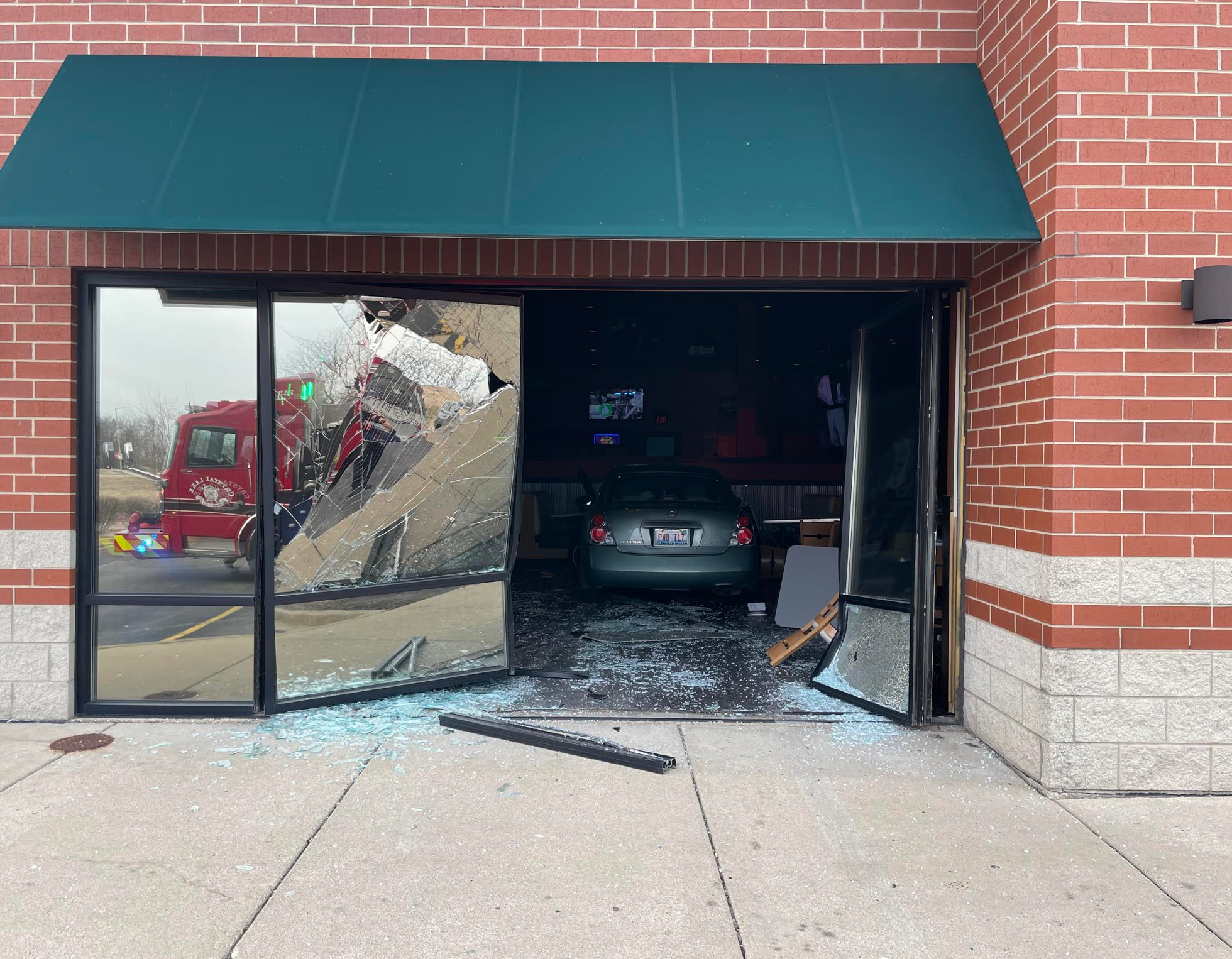 CRYSTAL LAKE, IL — A car crashed through a glass window at the Buffalo Wings and Rings in Crystal Lake Thursday evening, injuring four people inside. All four were taken to an area hospital with injuries that ranged from minor to serious, police said.