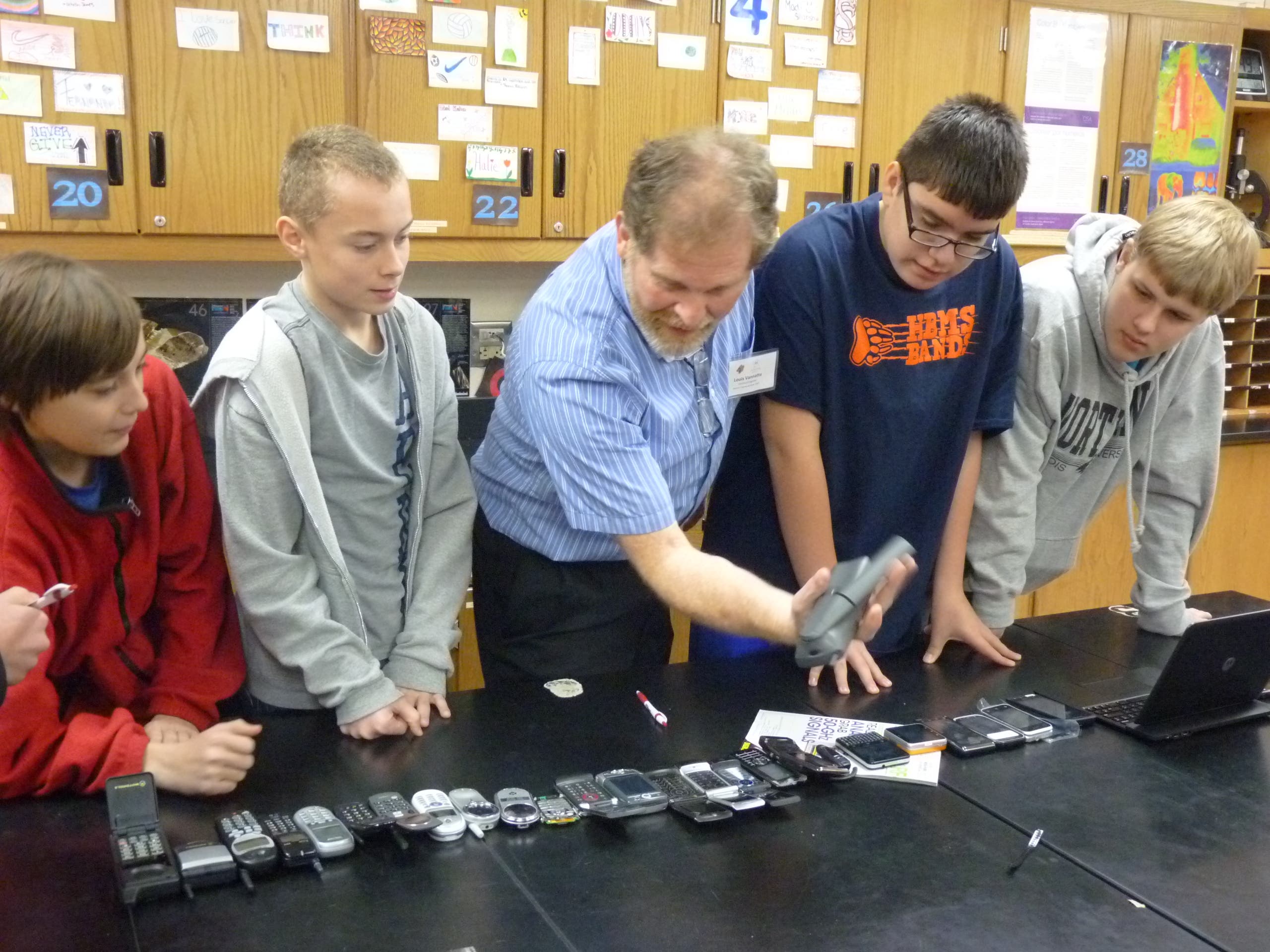 Six engineering professionals presented to students on Tuesday as they traveled from classroom to classroom on an “in-house field trip.” Students learned about the many iterations of today’s cell phones as well as how cities are built and monitored, how our healthcare system has advanced, and how engineers work with all industries to solve problems. Presenters included Harry Harman from Baxter & Woodman (a regional civil and environmental engineering firm), Randy Smith of General Kinematics (a manufacturing firm headquartered in Crystal Lake), Lou Vannatta from Motorola Mobility (global leaders in cellular communications), Mike Littrell from Cideas, Inc. (a large 3D printing/additive manufacturing company in Crystal Lake), Daniel St. John from Siemens Healthcare ( a global engineering and integrated technologies firm), and Marc Strong from Northrop Grumman (a global aerospace and defense technology company).