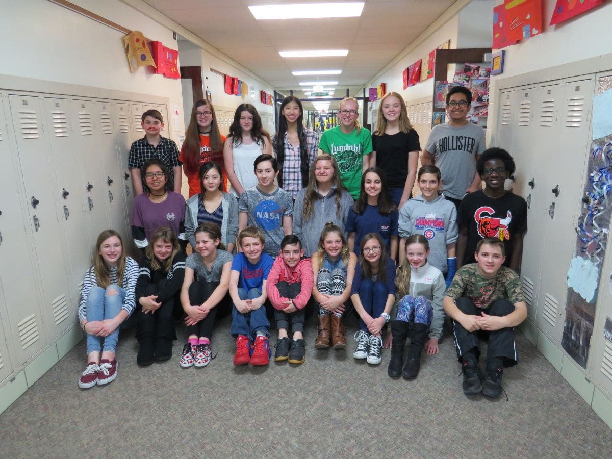 Photo caption: 2016-17 Lundahl Middle School Student Council. Front Row: Madison Ross, Meg Norten, Ellie Gorak, Josh Ross, Nate Karbowski, Kiara Hein, Brooklyn Paruolo, Ashlynn Henry, Greyson Johnstone; Row 2: Amy Perez, Christina Lin, Skye McCord, Ella Cox, Isabella Farrington, Will Hough, David, Welte-Hart; Row 3: Matt Gross, Iona Dillon, Jenny King, Kelly Raines, Annie Guss, Emily Gray, Zain Bhatti