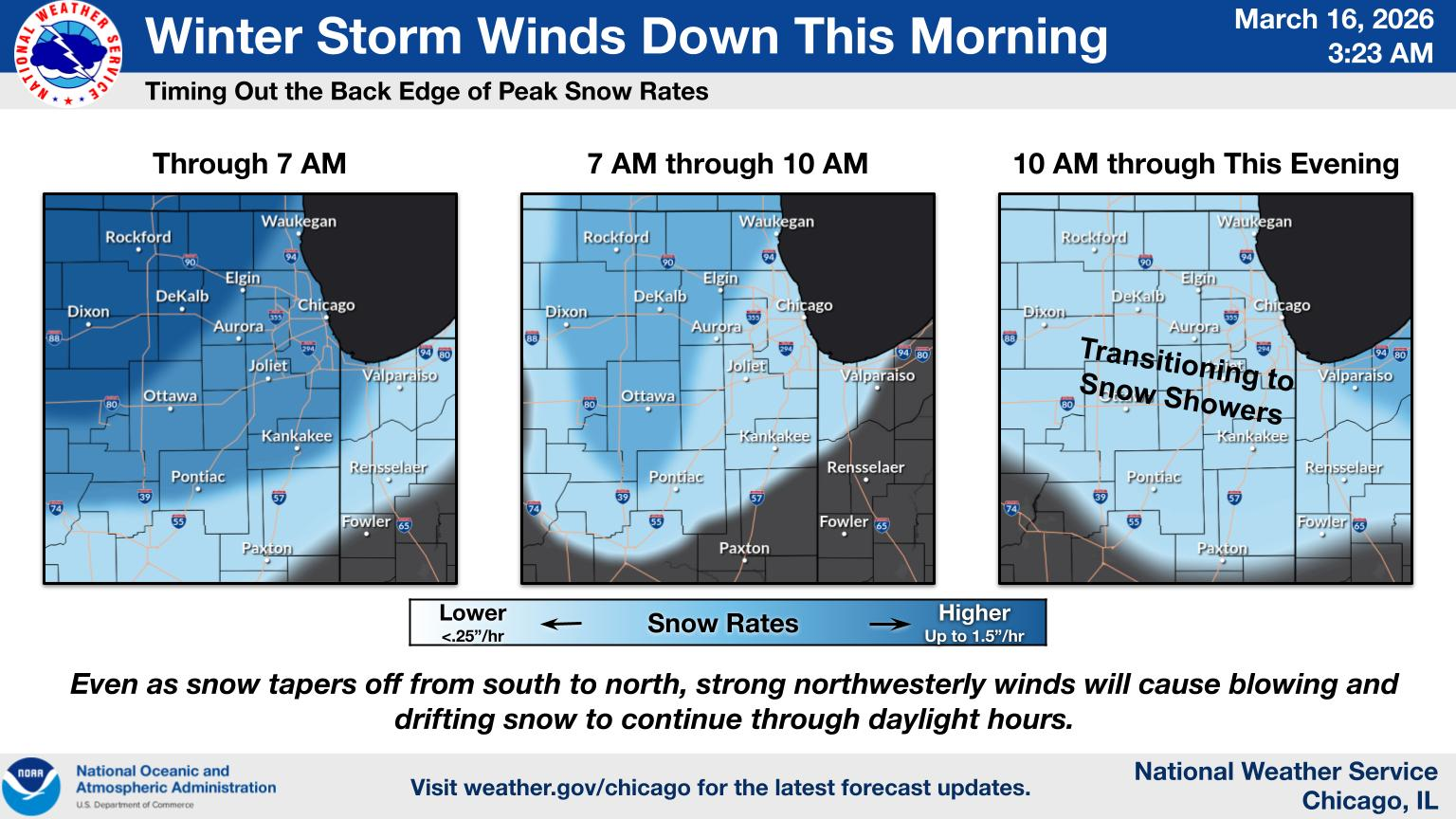The blizzard warning covers Boone, DeKalb, Lee, Ogle, Winnebago, and McHenry Counties, and is in effect through 1 p.m.