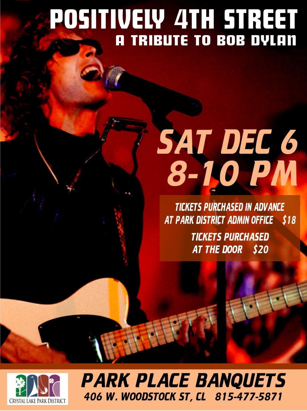 Tickets are $18 tickets purchased in advance at the Crystal Lake Park District Administrative Office, One East Crystal Lake Avenue, Crystal Lake or $20 purchased at the door. Cash bar available.