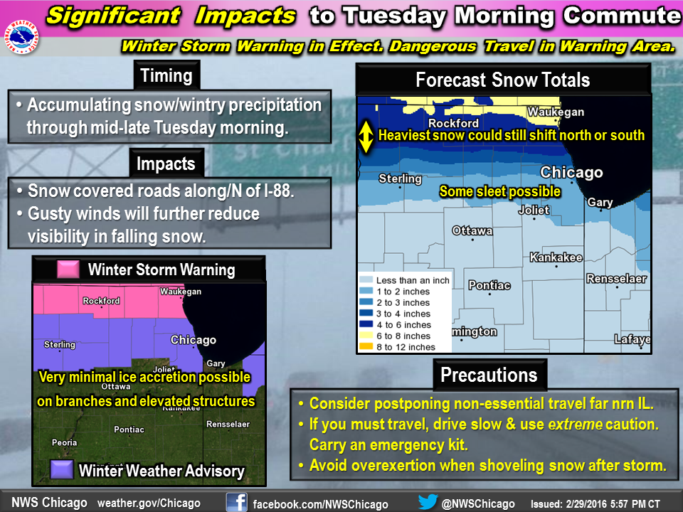 The heaviest snowfall will be for the far northern Illinois counties. Heavy, wet snow accumulations of one to four inches is expected for Lake and McHenry counties while Kane, DuPage and Cook counties could see one to three inches, according to the National Weather Service. All of those counties are under a winter weather advisory through 9 a.m.