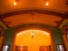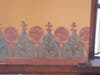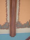 I repaired the large cracks and began the wall art details. My initial impressions of the art was that it was stenciled throughout the room. Closer inspection proved it to be all freehand work. Each small design was slightly different from its adjacent neighbor twin. I carefully matched the colors using artist oils and very slowly began that part of the restoration.
