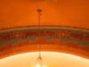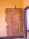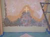 I was commissioned: restore the art as close to the original design. There was only ONE black and white photo of the chapel's front wall art. My work began in April of 2009. I chipped away two small sections of the original plaster wall and took the wall samples to my paint supplier. A spectrograph analysis of the colors was done so that paint formulas were created.